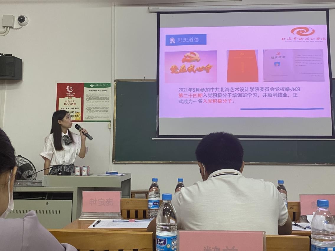 为了促进我校学风建设,进一步落实国家奖学金政策,本着公平、公正、公开、择优、透明的原则,发挥资助育人的功能和效力,激励广大学生发奋学习、全面发展、立志成才。2021年9月24日下午,北海艺术设计学院2021-2022年度国家奖学金答辩会在功德楼110教室成功举行。本次答辩会由学工处处长班媚主持,由设计艺术学院院长李林平、动画与传媒学院院长庞定坤、人文教育学院院长熊秀峰、美术学院副院长龚为、公共基础教学部主任杨莹、创新创业学院院长云曼、建筑与环境艺术学院第二党总支副书记岳莹及服装党支部书记曾麟、建筑与环境艺术学院学工办主任曲玥担任评委。34名由二级学院推选的国家奖学金候选人参加了此次答辩会。