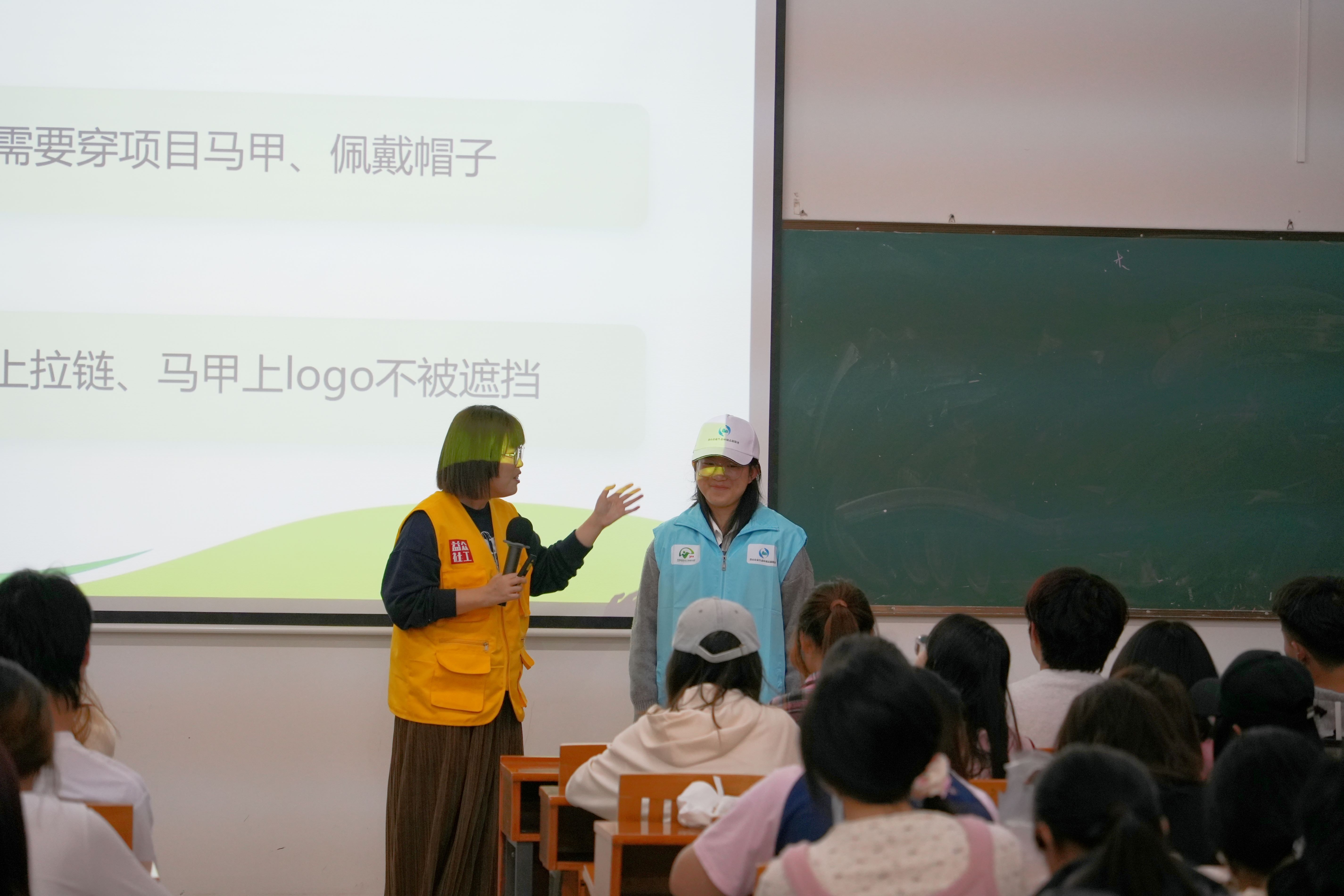 在志愿者培训环节,服务中心老师向学生们介绍了志愿者工作要求及活动拍照要求等,通过志愿者的宣传从而让更多学生加入到保护环境的具体实践中来。