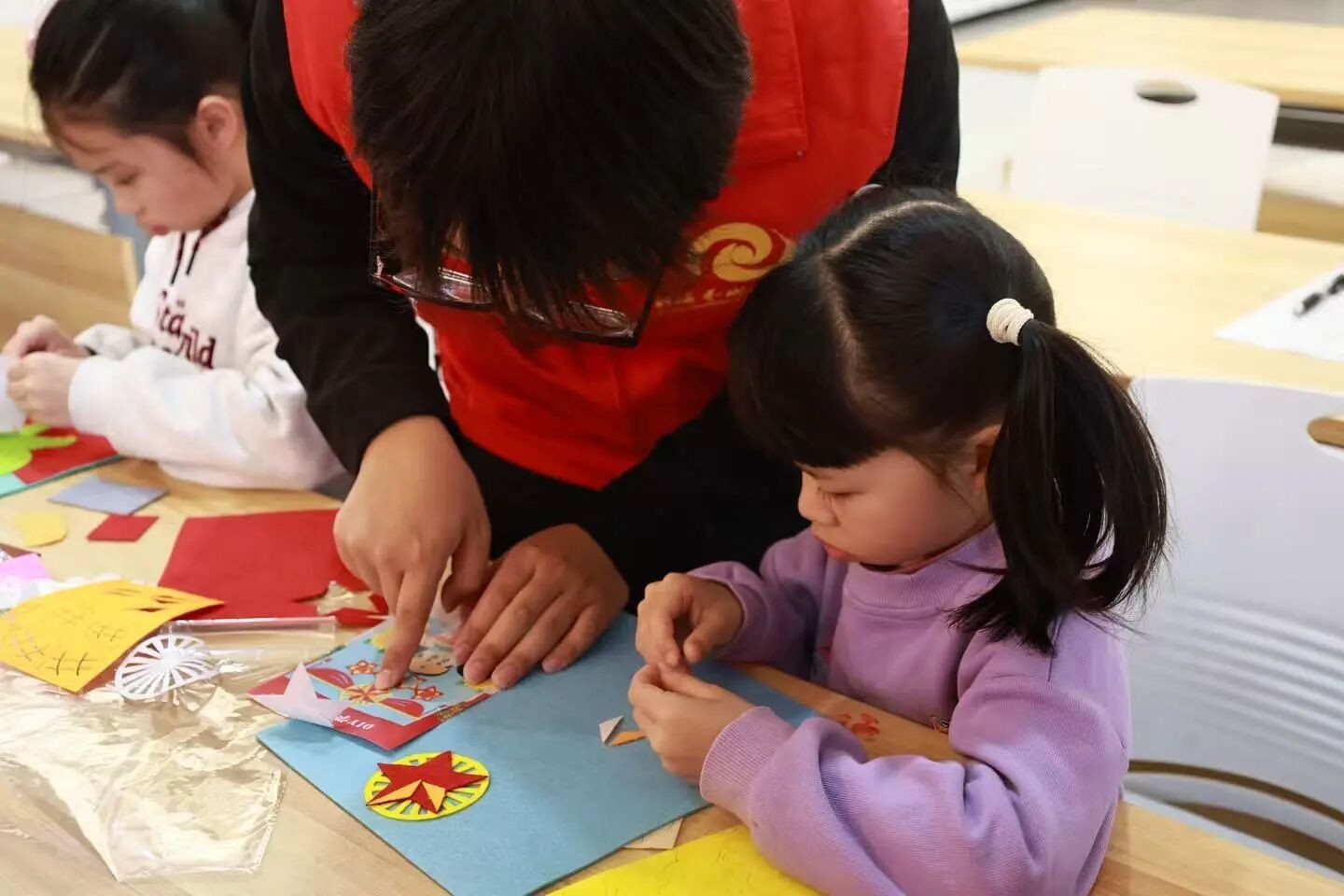 次日,雷锋主题手工课堂接续开展。志愿者们准备好材料,手把手带领孩子们通过拓印和拼贴定格雷锋光辉形象,将对榜样的崇敬融入每一件作品。创作过程中,志愿者们重温雷锋事迹,让红色教育与动手实践深度融合。