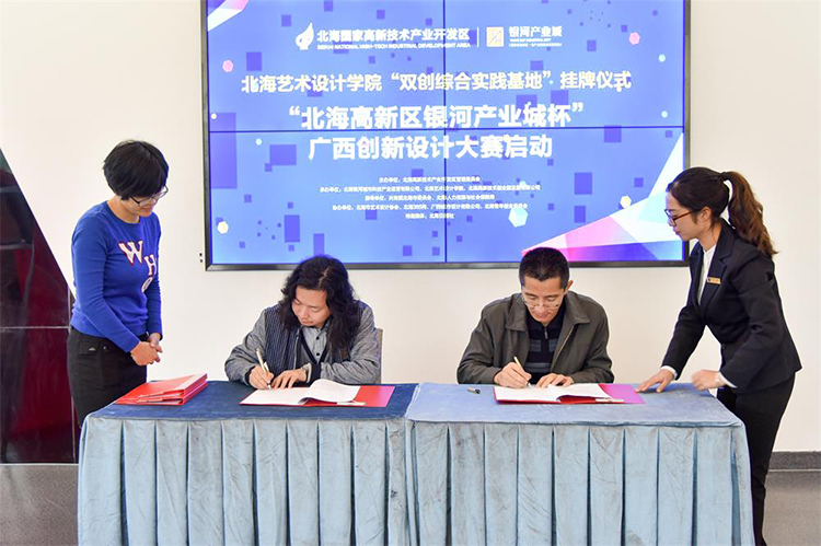 北海高新技术产业开发区管委会、北海艺术设计学院、北海人力资源与社会保障局、共青团北海市委员会的相关负责人,还有我院的师生们共同参加了北海艺术学院双创综合实践基地挂牌仪式暨“北海高新区银河产业城杯”广西创新设计大赛启动仪式。