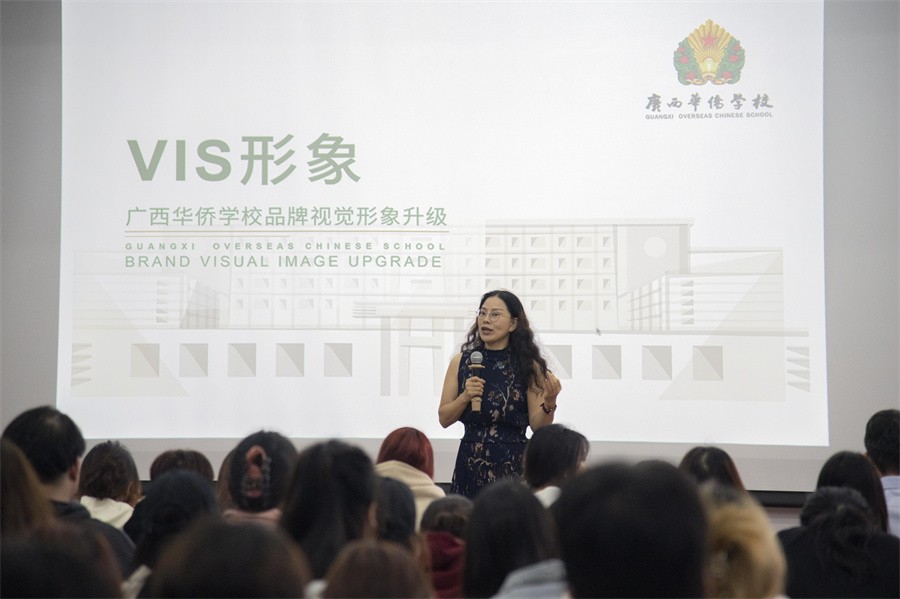 在广西华侨学校VI设计、广西壮族自治区博物馆VI设计、广西音乐博物馆文创设计、广西壮族自治区博物馆文创设计四个方面,李娟教授分享了自己的艺术见解和研究成果。李娟教授指出,在设计过程中不仅要遵循设计原则,同时还需要兼顾甲方需求,寻找二者之间的平衡是一个必要且复杂的任务。基于此, 李娟教授以广西华侨学校VI设计项目为实例,详述如何在满足甲方要求的同时应用巧妙的设计策略进行方案转变,如运用简洁化的线条和色彩,并巧妙地扩大辅助图形,最终形成了一个既符合甲方需求,又展现出具有形式审美的设计方案。