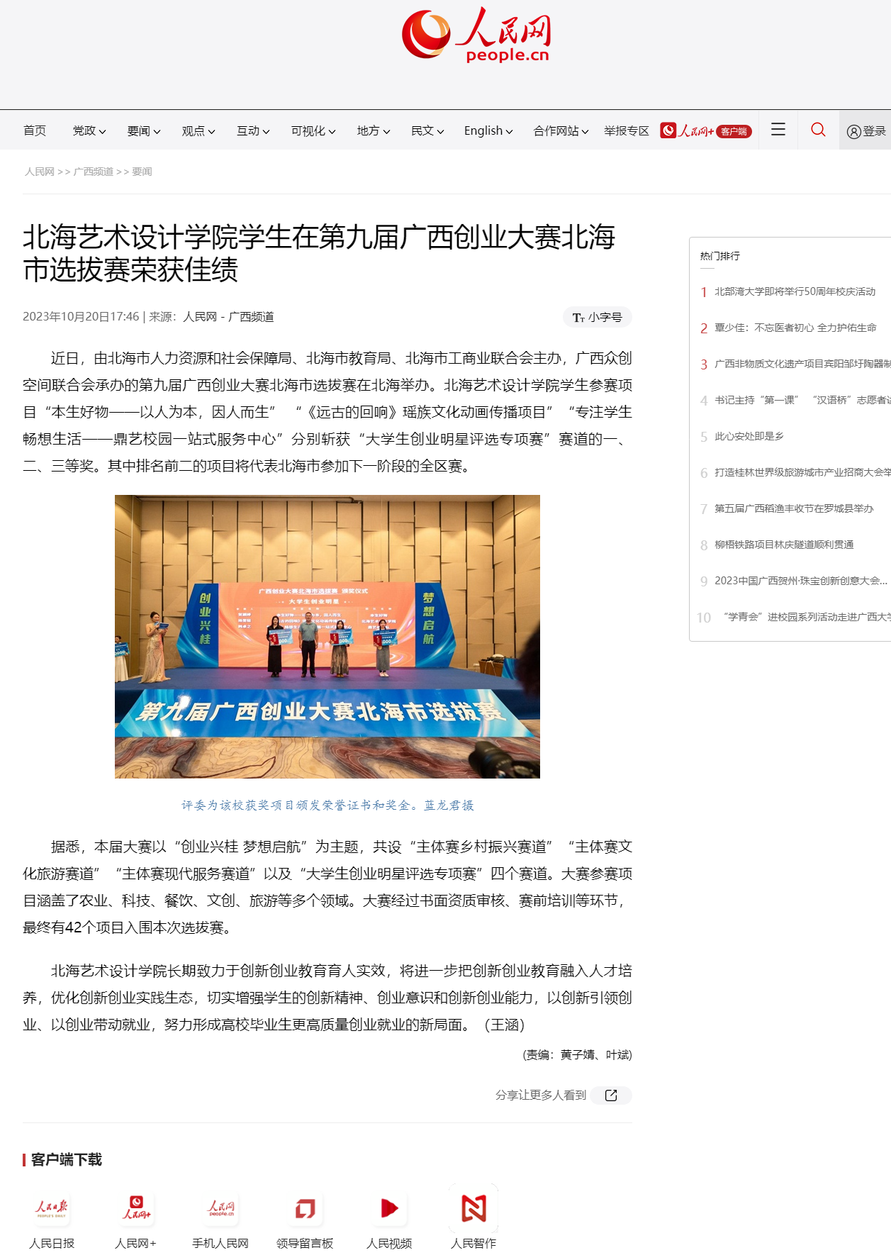 人民网:北海艺术设计学院学生在第九届广西创业大赛北海市选拔赛荣获佳绩