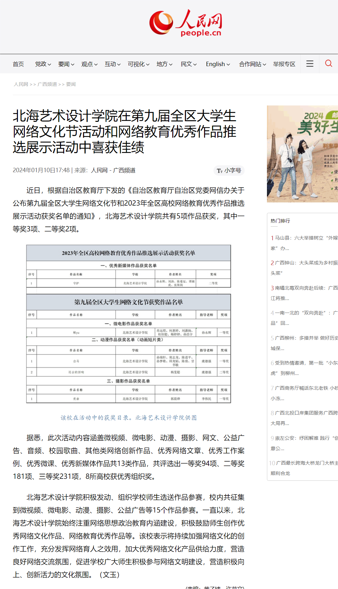 人民网:北海艺术设计学院在第九届全区大学生网络文化节活动和网络教育优秀作品推选展示活动中喜获佳绩
