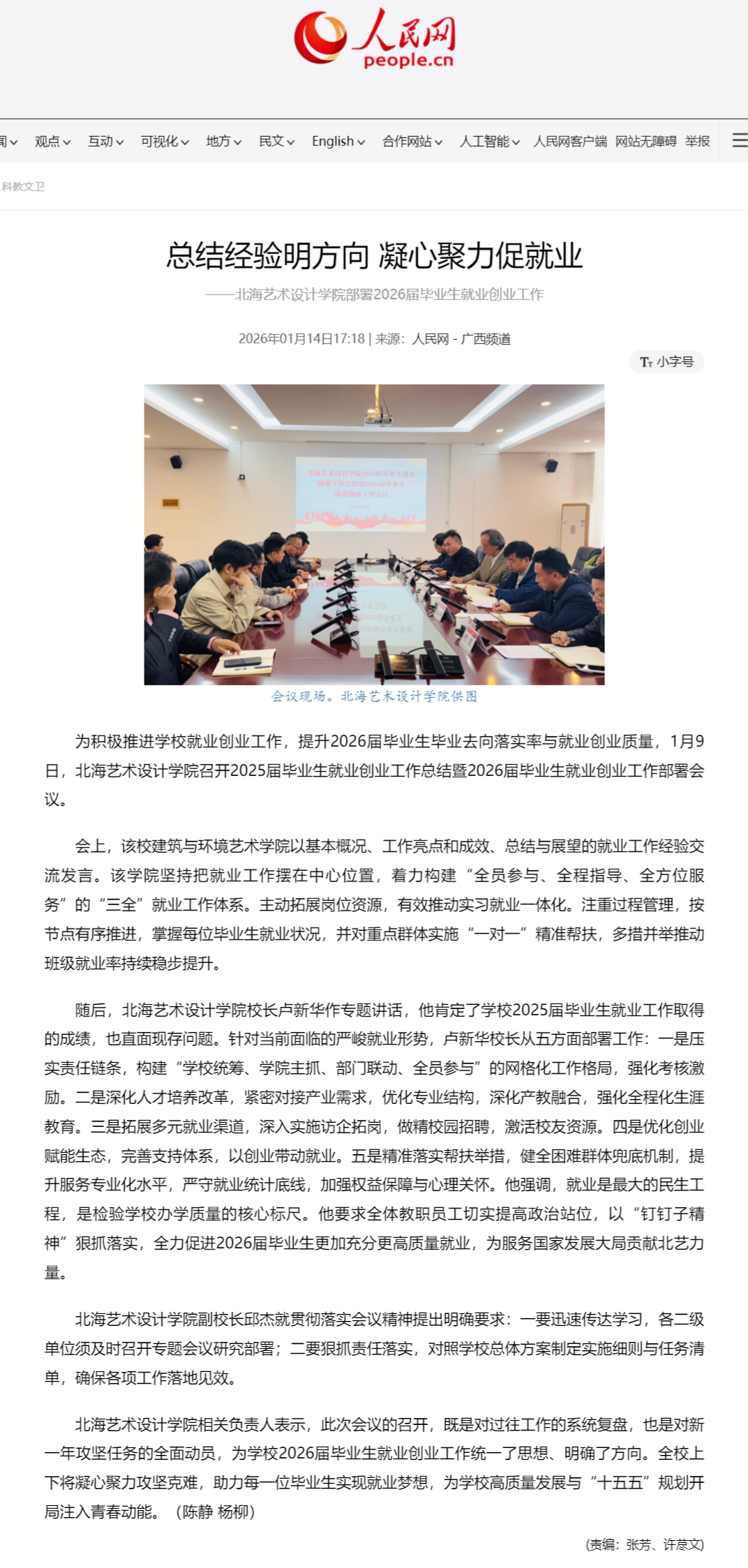 人民网:总结经验明方向 凝心聚力促就业——北海艺术设计学院部署2026届毕业生就业创业工作