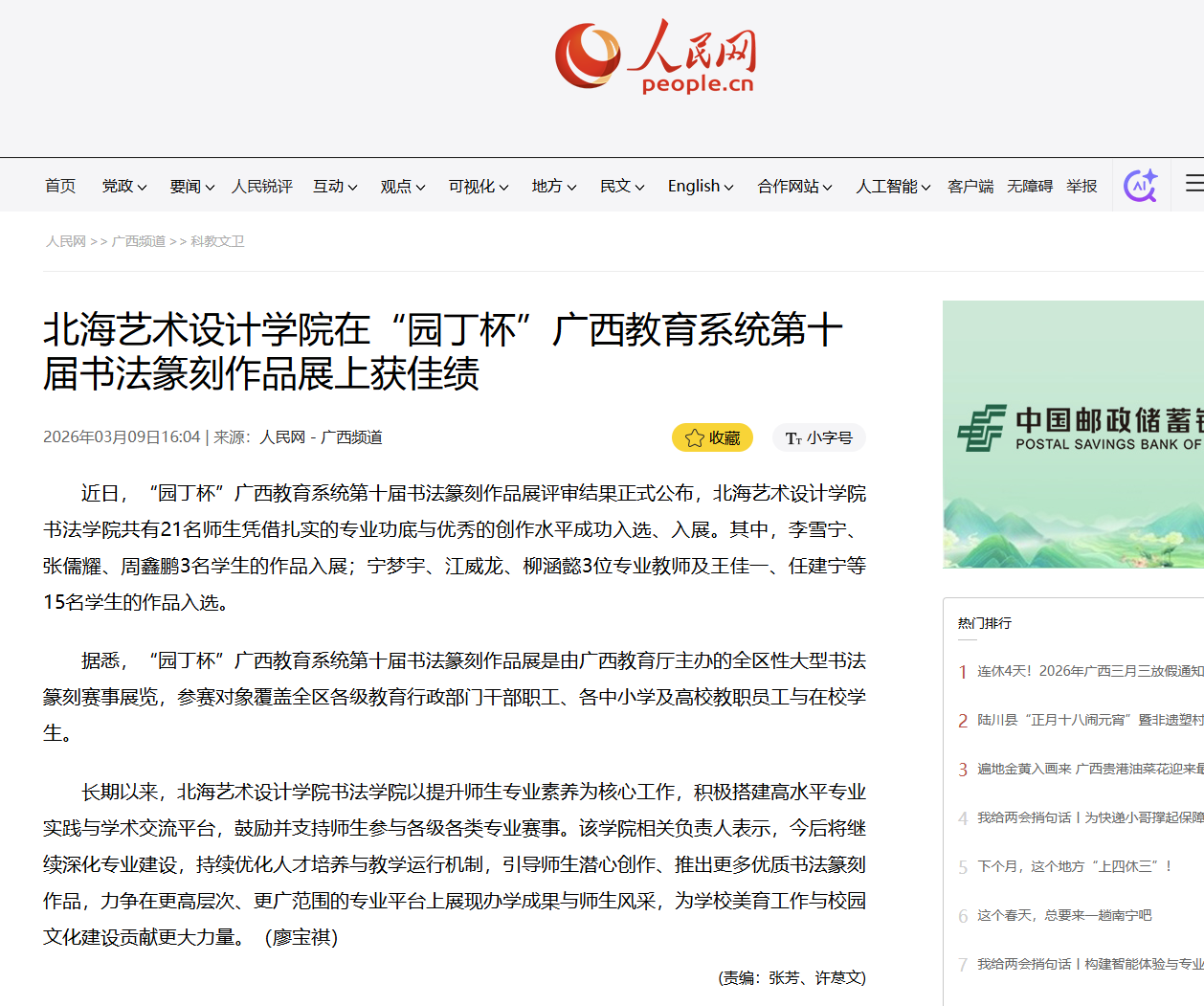 人民网:北海艺术设计学院在“园丁杯”广西教育系统第十届书法篆刻作品展上获佳绩
