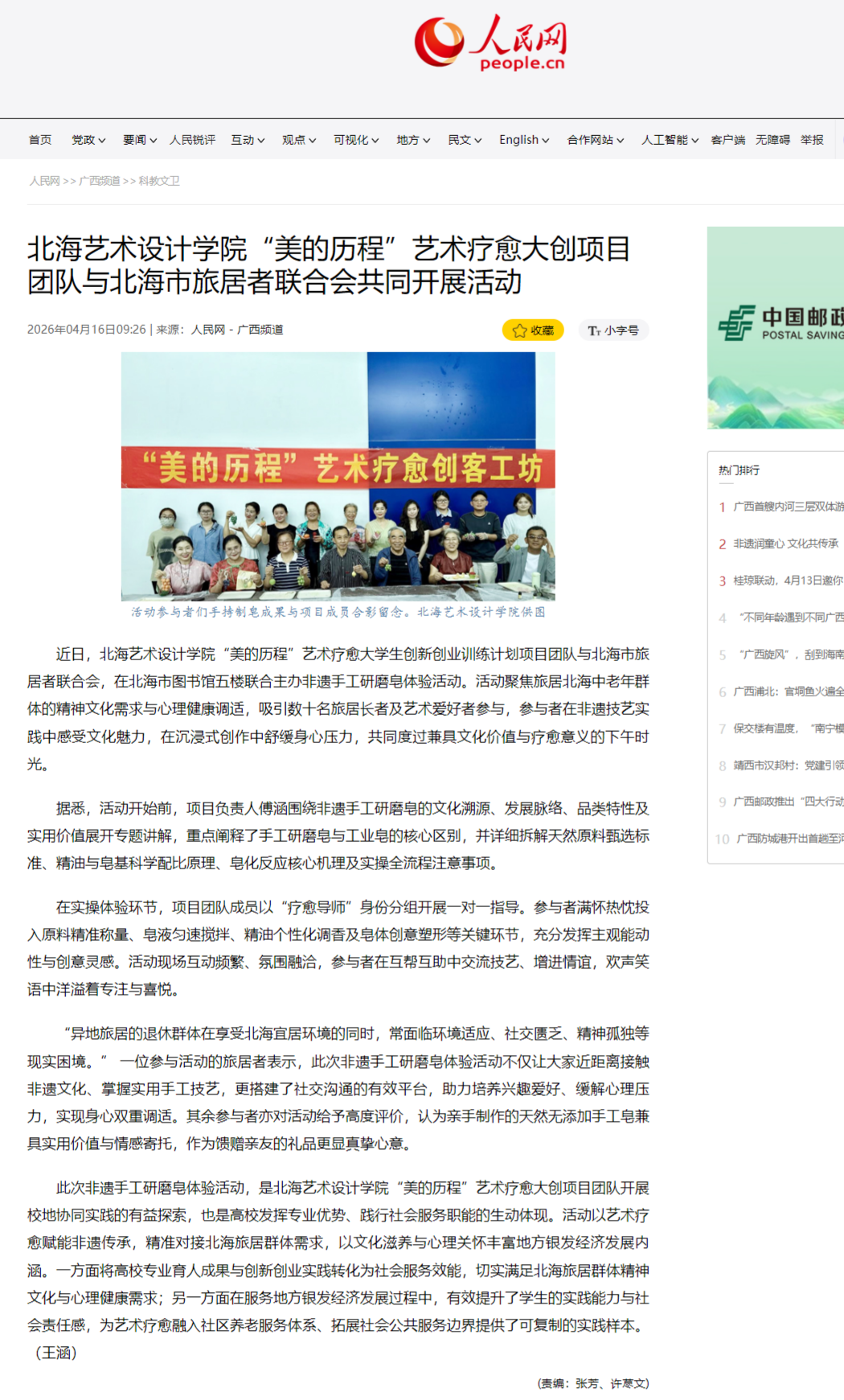人民网:北海艺术设计学院“美的历程”艺术疗愈大创项目团队与北海市旅居者联合会共同开展活动
