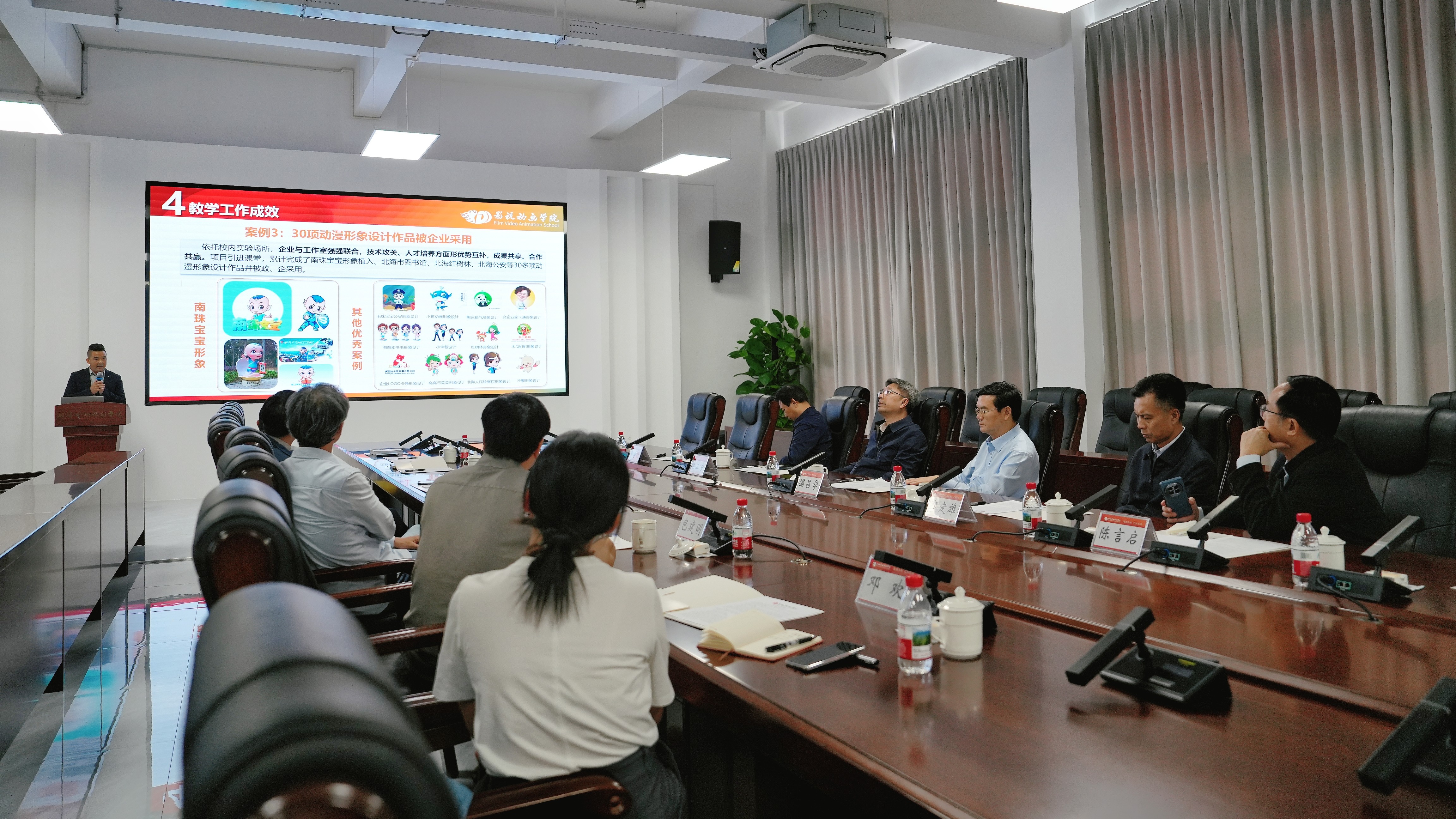 调研会上,我校校长卢新华介绍了学校的基本情况。学校近年来致力于服务国家文化产业发展战略,在影视动画与数字媒体艺术领域取得了显著的教学与创作成果。学校已开设七个与影视创作相关的专业,建有AR实验室、录音实验室等80多间配套实验室。师生创作的《海上丝路南珠宝宝》动画片,在2017年“一带一路”国际合作高峰论坛在北京召开时,在央视少儿频道黄金时段播出,获得广西第十四届精神文明建设“五个一工程”优秀作品奖。原创网络动画片《勇敢的阿牛哥》入藏国家图书馆。动画专业学生动画短片作品《守神》《白马》连续两年获得广西网络动漫大赛金奖。舞蹈影像作品《渡》,在2024年匹兹堡国际舞蹈电影节上,获官方选择奖。