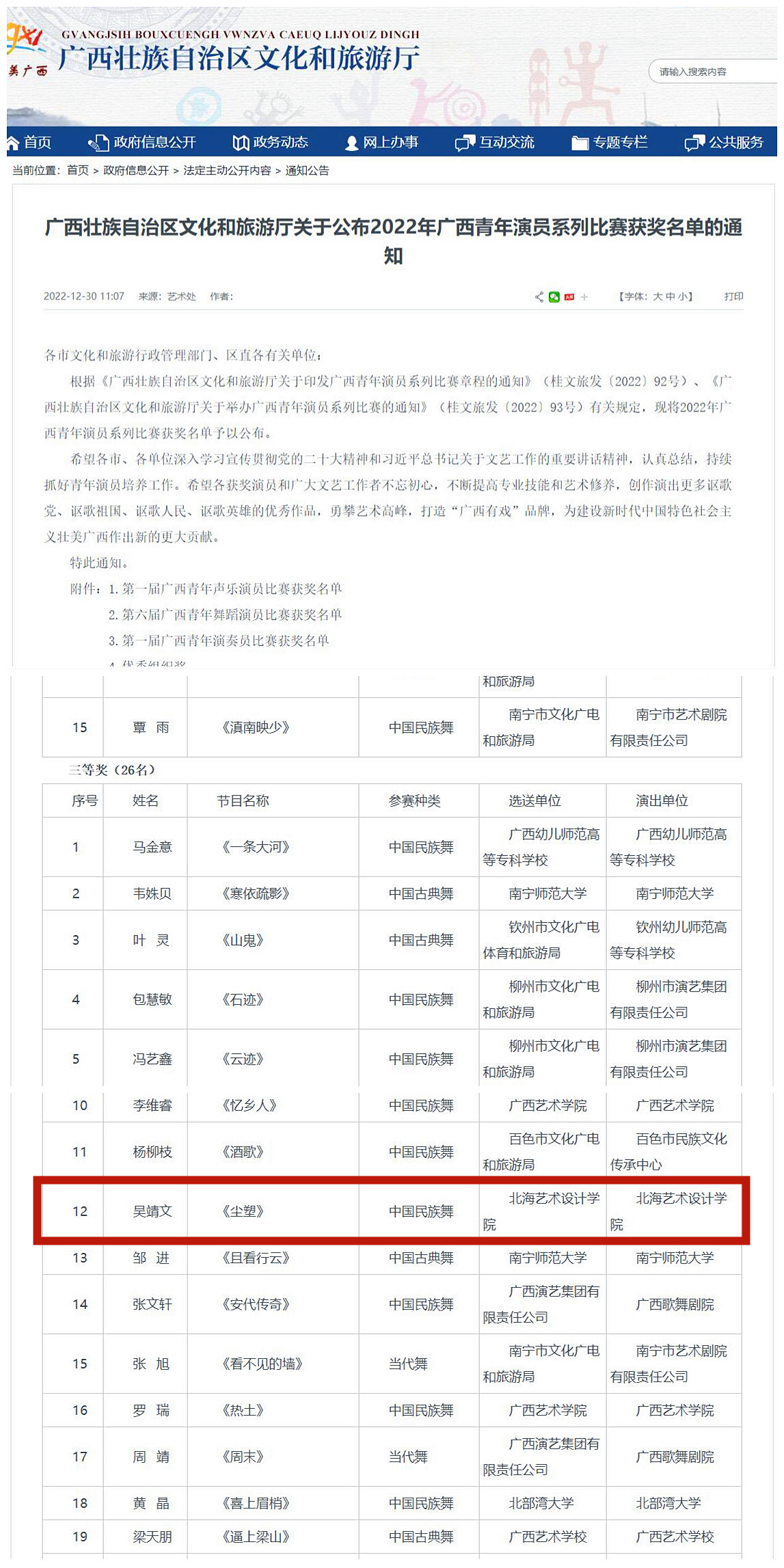 近日,由自治区文化和旅游厅主办,广西文化产业集团有限公司承办的第六届广西青年舞蹈演员比赛决赛在南宁民族大剧院顺利举行。我校两名舞蹈表演专业学生吴靖文、赖德彬在全区各级专业院团、艺术院校等88家单位、436个舞蹈作品、218名舞蹈演员中脱颖而出,成功进入决赛。其中学生吴靖文在决赛中取得了三等奖的优异成绩。