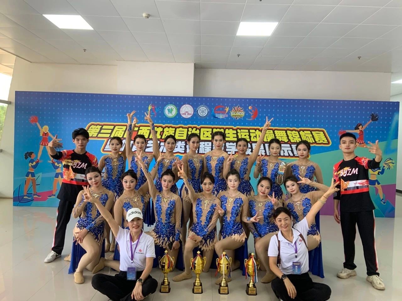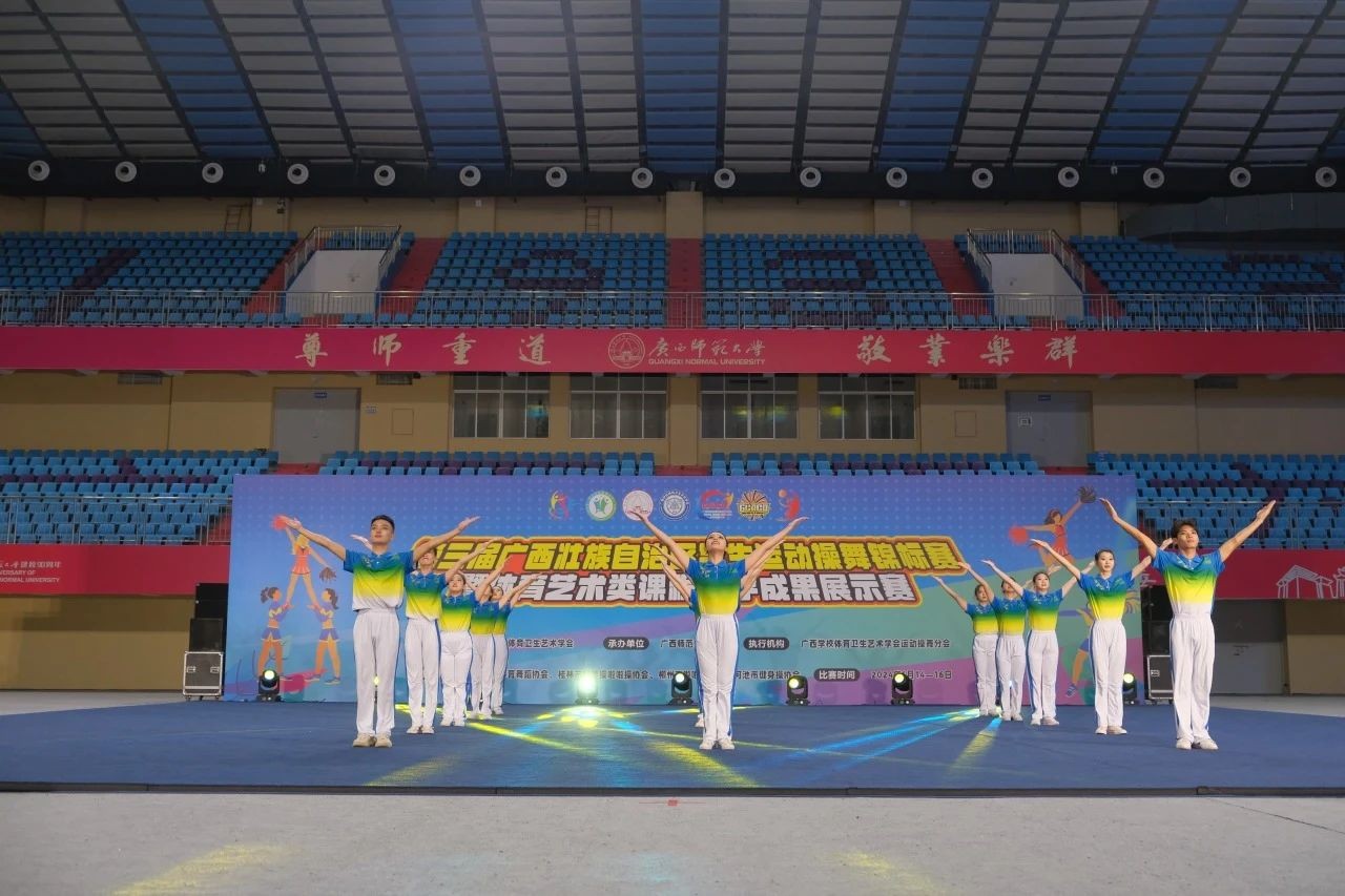 6月14-16日,第三届广西壮族自治区学生运动操舞锦标赛暨体育艺术类课程教学成果展示赛在广西师范大学雁山校区综合体育馆落下帷幕,我校“战马”啦啦操队斩获普通本科组“第九套广播体操、集体爵士自选、双人爵士自选、双人花球自选”4项冠军,民族民间舞季军,同时斩获“体育艺术类课程教学成果展示赛”二等奖。