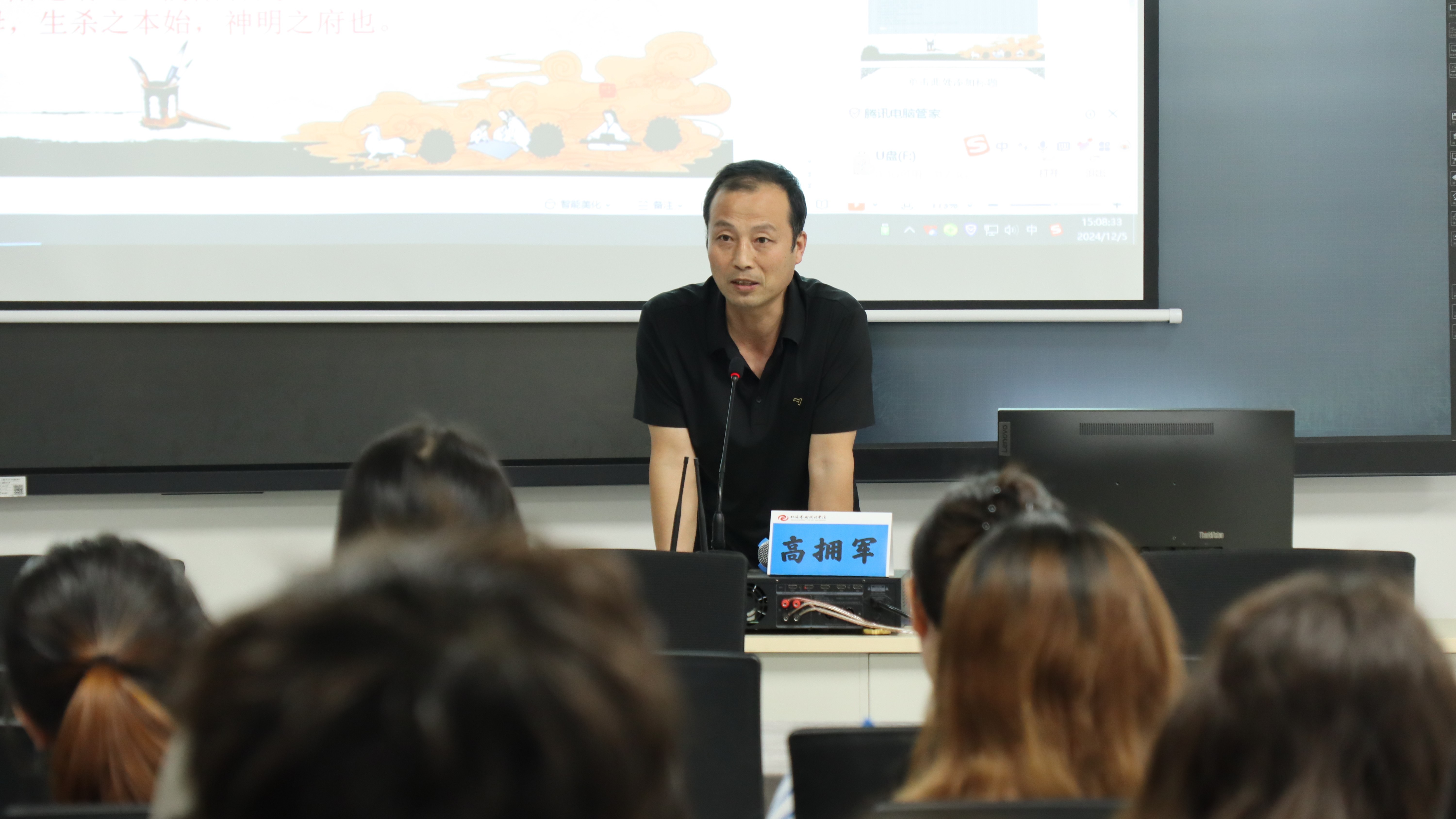 高拥军先生以其深厚的书法造诣与丰富的学术经验,围绕“书法的文化品格”这一主题,展开深入而精彩的讲解。他从书法的历史渊源讲起,逐一剖析书法在不同历史时期的文化内涵和艺术特色,并强调书法作为中国传统文化瑰宝的独特地位和价值。座谈会上,高拥军先生还与参会师生进行积极互动,耐心解答大家关于书法学习、创作及文化理解等方面的问题。他的讲解深入浅出,既具有学术性,又贴近实际,赢得了在场师生的阵阵掌声。