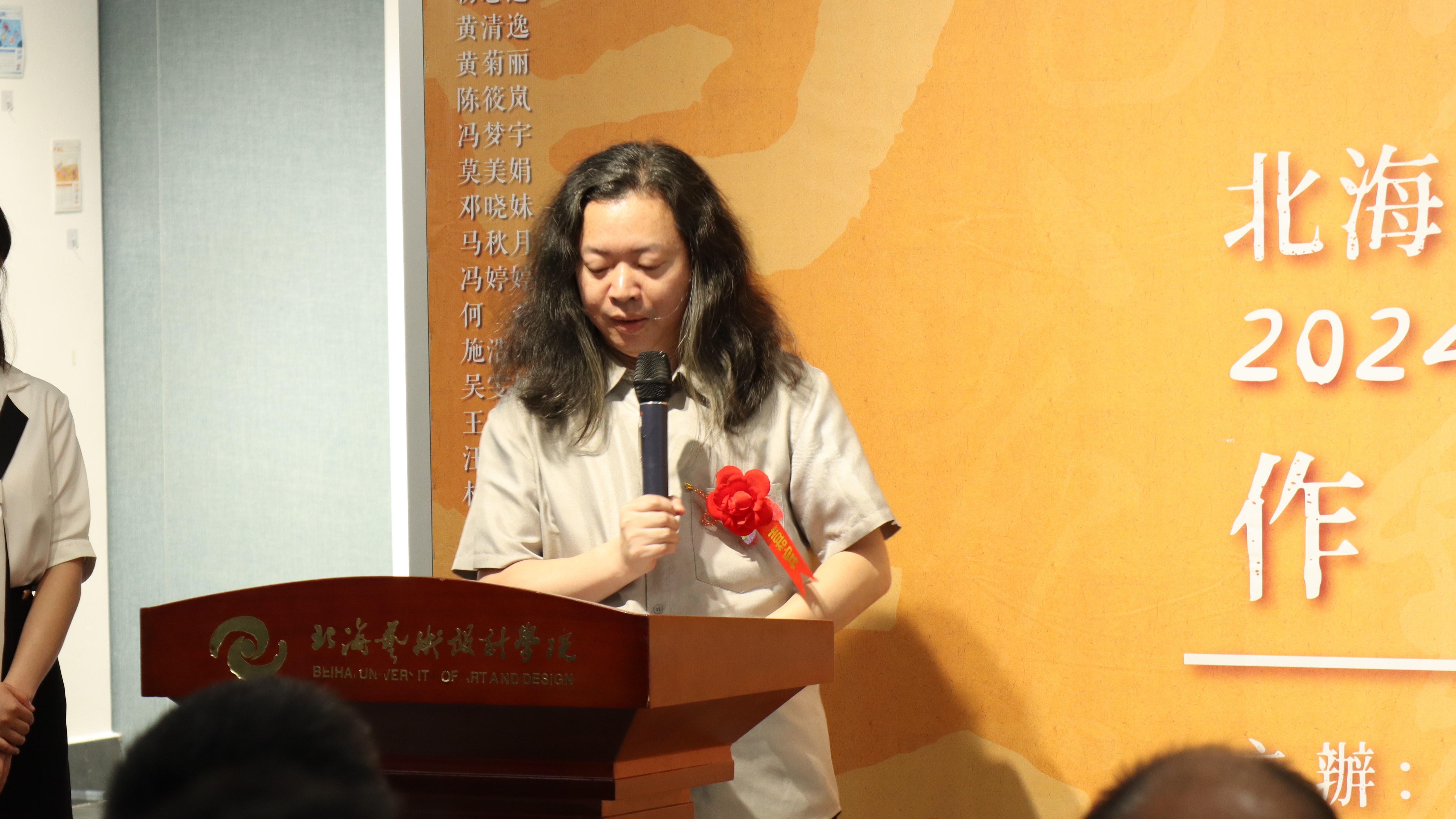 开幕式在热烈的掌声中拉开帷幕。主持人首先向在场的领导、老师及同学们致以诚挚的问候,并介绍出席本次活动的各位领导,包括北海艺术设计学院常务副校长胡胜、党委副书记陈毅华、美术学院执行院长龚为、创新创业学院院长云曼及副院长陈渤水、哲学学院院长李水亮、动画与传媒学院副院长刘涛、建筑与环境艺术学院副院长蔡世伟、书法学院院长黎东明及常务副院长苏乃从、党支部书记喻广林、副院长李东垚,以及书法学院的教授邓建华、万应均、王见等。