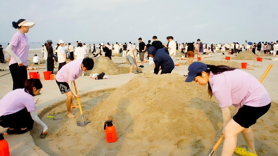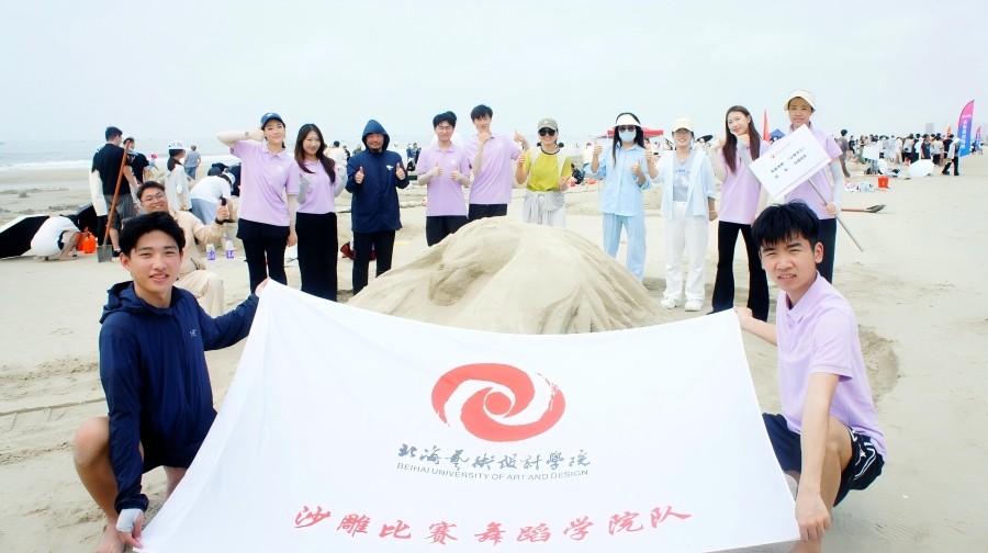 活动现场阳光和煦、海风宜人,处处洋溢着热烈欢快的氛围。在沙雕比赛中,我院师生俯身堆沙、抬手塑形,弯腰勾勒、细心打磨,每一个动作都认真专注,大家以沙为媒、巧思创作,精细雕琢间展现扎实艺术素养,最后创作出的沙雕作品《以梦为马》凭借精巧构思与细腻做工荣获三等奖。