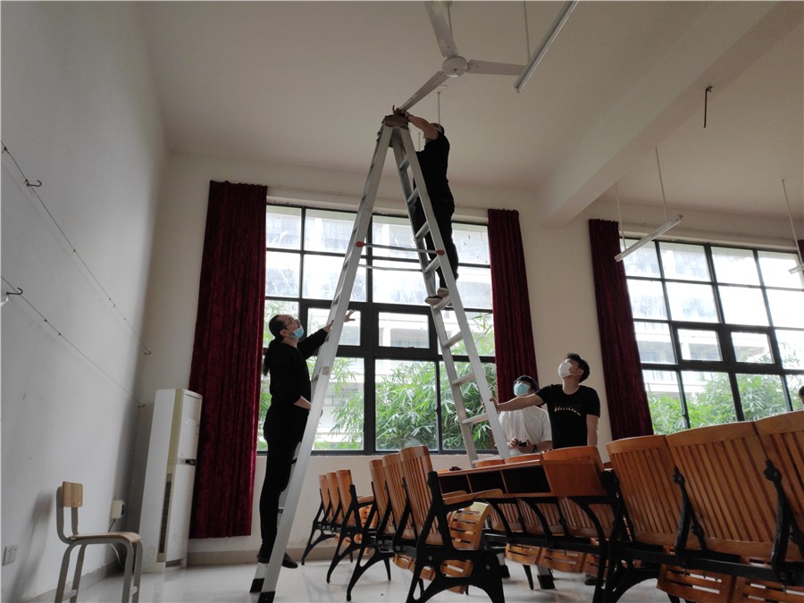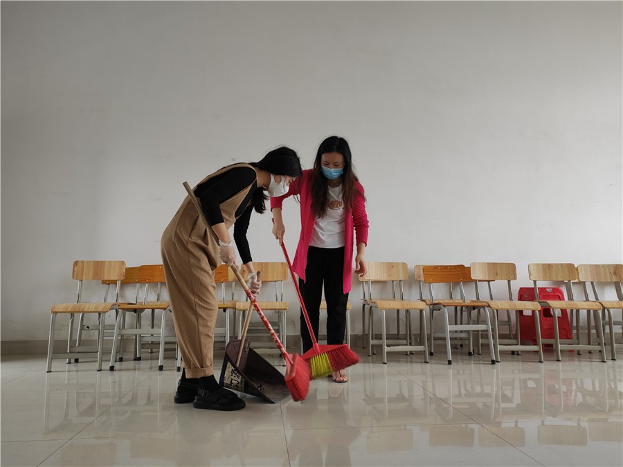 5月1日至2日,学校统筹安排各部门对照疫情防控卫生标准,对东西校区的教学楼、办公楼、宿舍区、图书馆、实训室、工作室、食堂、绿化区等公共区域开展卫生死角清洁工作,并对照防控要求规范教室桌椅摆放及室内防疫标识的张贴。经过全校教职工两天的努力,门窗、风扇、墙面、栏杆、地面擦拖干净,布置美观,物品摆放整齐,校园环境整洁一新。