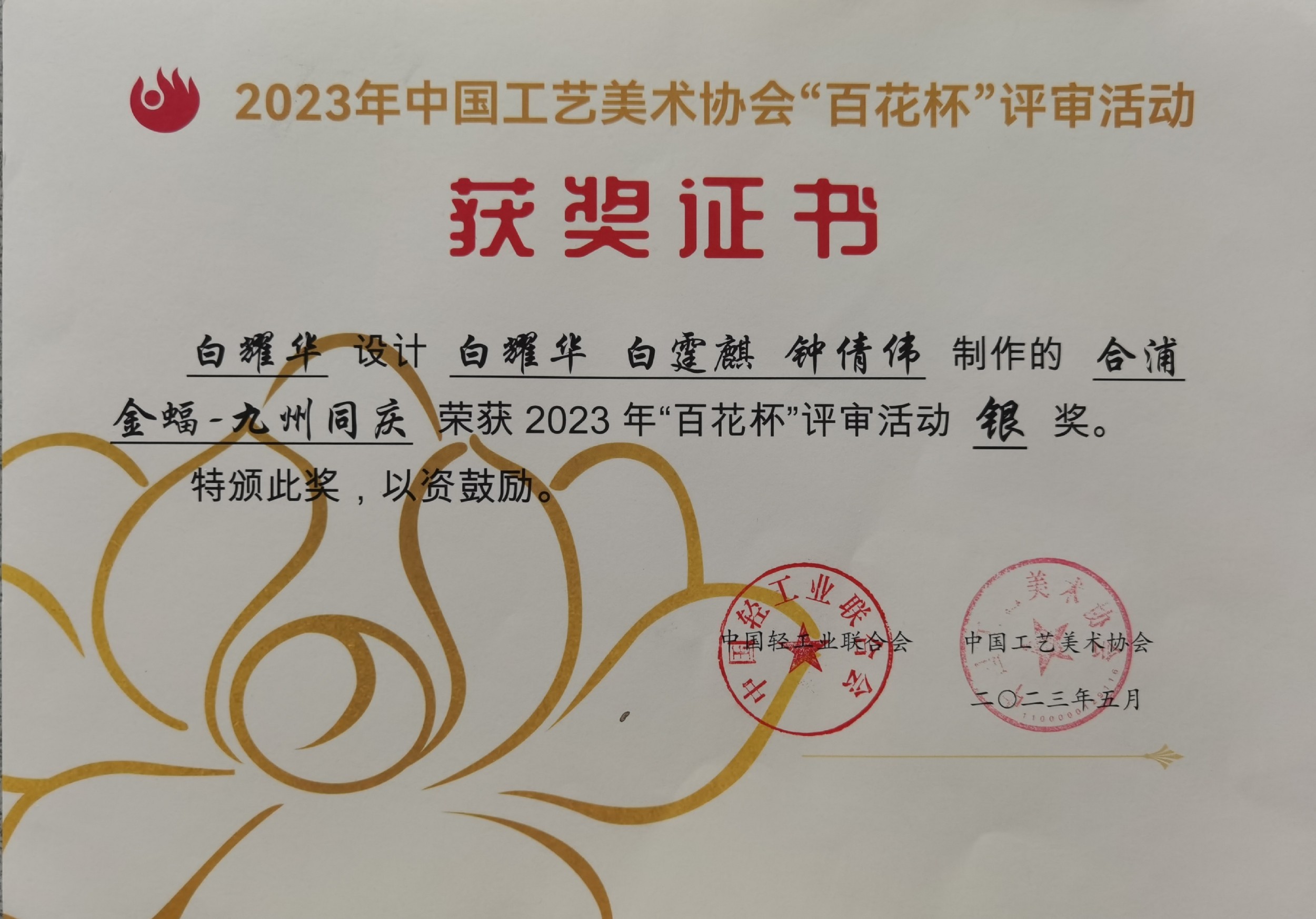 在实践指导方面,白耀华教授带领学生深入角雕创作一线,从选料、设计到雕刻,每一个环节都耐心指导,帮助学生掌握角雕技艺的精髓。他还积极参与指导青年教师,分享自己多年的创作经验与艺术理念,提升教师的教学与实践能力,助力学校打造高水平的师资队伍。在他的指导下,许多学生在各类艺术活动与比赛中崭露头角,为学校争得了荣誉,也为合浦角雕技艺的传承培养了新生力量。同时,通过与学校的合作,合浦角雕这一非遗文化在校园内得到广泛传播,丰富了校园文化内涵,促进了传统文化与现代教育的融合。此外,白耀华还获得了众多荣誉称号。2018年6月9日,他被评为“中国工艺美术大师”;2020年12月29日,荣获“广西工匠”称号;2021年8月,荣获广西五一劳动奖章。2021年,他设计、白霆麒和吴兴初制作的角雕《咏春》在第56届全国工艺品交易会仿真植物及配套用品展上荣获“金凤凰”创新产品设计大赛金奖;2023年5月,他设计的合浦金蝠《九州同庆》荣获2023年“百花杯”评审活动银奖;2024年5月,作品《祥和九州》在第四届“百鹤杯”工艺美术设计创新大赛中荣获百鹤新锐奖。