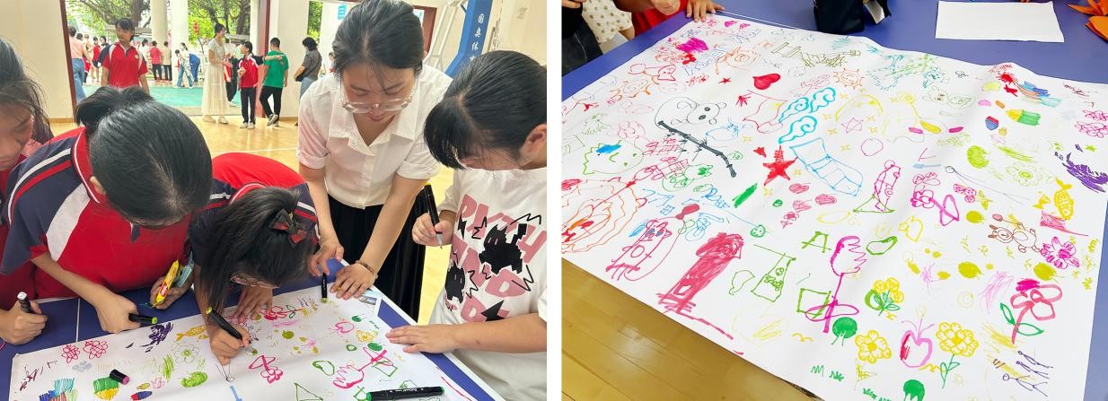 活动开始,北海市特殊教育学校校领导和同学们对我院教师的到来表示热烈欢迎。在绘画创作环节,我院教师与孩子们围在一起,共同绘制一幅充满童趣与希望的集体画作。艺术是一种无声的语言,能够跨越沟通障碍,直达心灵,我们希望通过绘画,让孩子们感受到创作的快乐,增强他们的自信心,用画笔表达自我。最终,一幅幅凝聚了孩子们纯真梦想的画作被保留下来,成为本次活动的珍贵纪念。