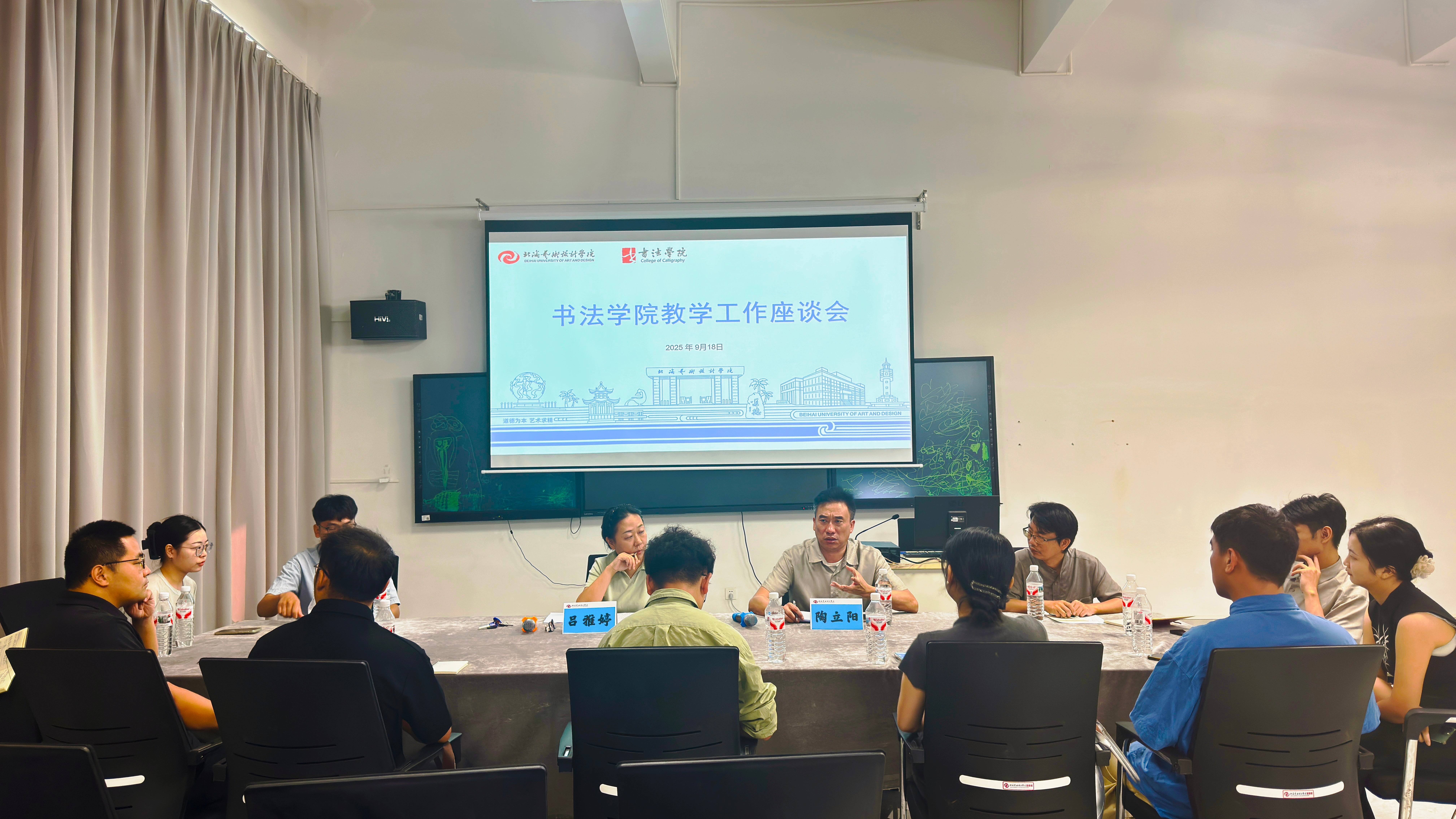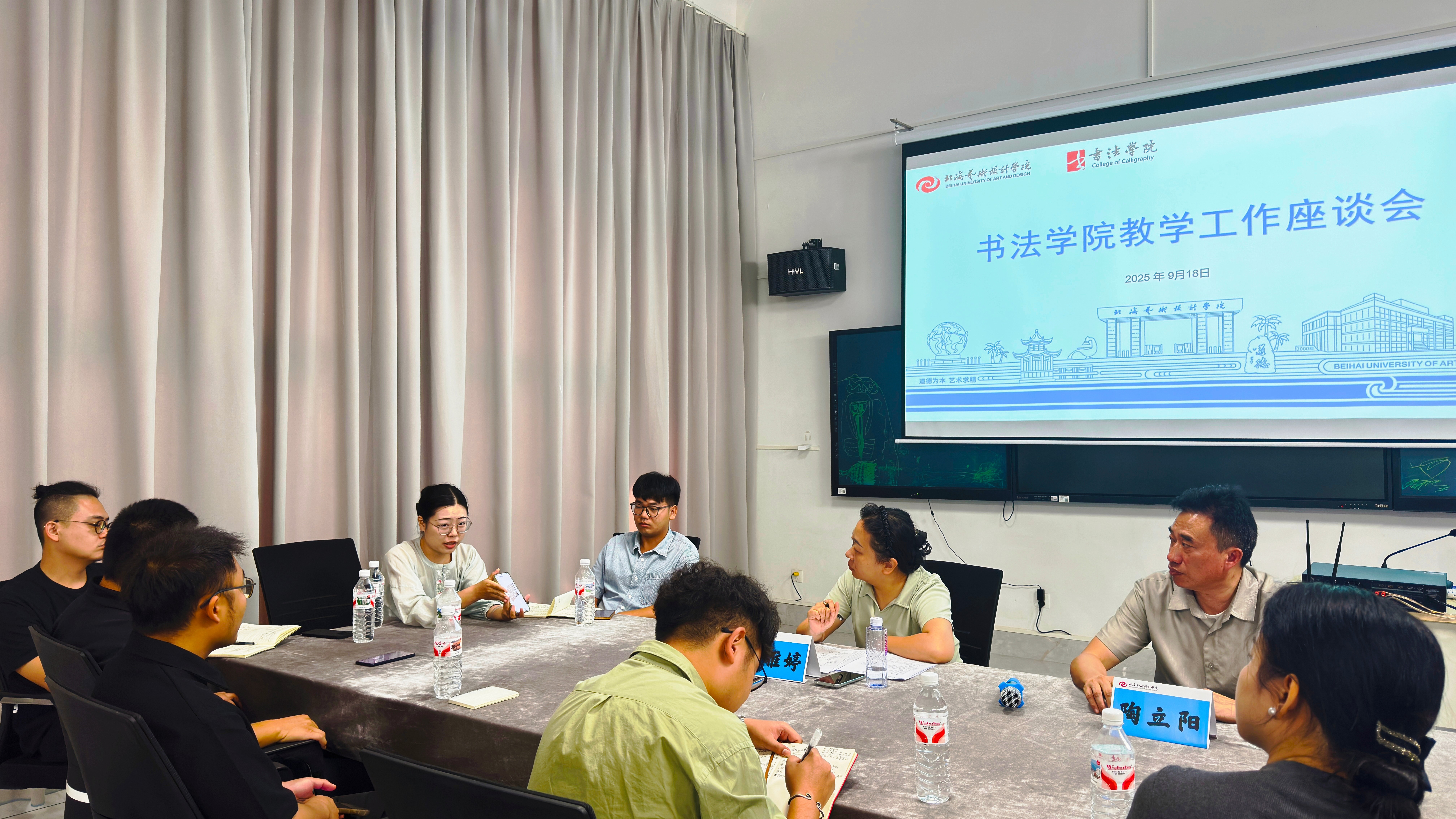 9月18日上午,副校长陶立阳、教务处副处长吕雅婷一行走进书法学院,与学院教师在艺德楼507教研室开展教学工作座谈会,探讨学科发展方向。书法学院常务副院长苏乃从、党支部书记喻广林、分管教学副院长李东垚、分管学工副院长李家琪、黄荣婷、韦志忍及各部门主任和骨干教师代表参会,围绕“书法学院人才培养及人工智能赋能教学”主题深入交流,为专业教学高质量发展凝聚共识。