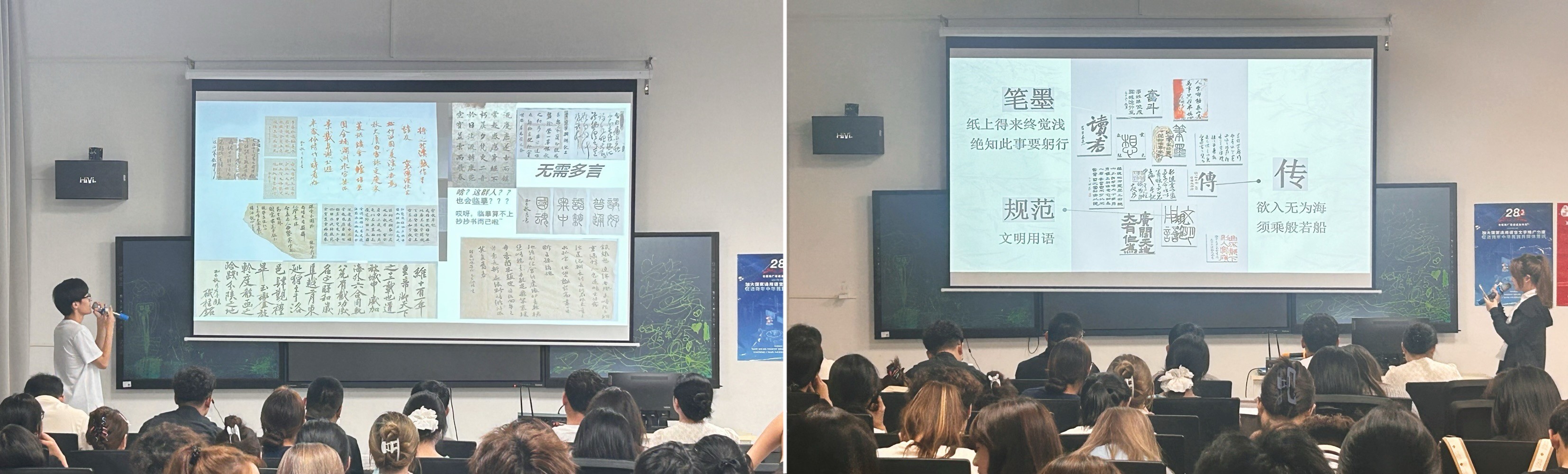 在汇报环节,各宿舍代表围绕“推普+书法”主题,分享了宿舍装饰理念、作品内涵与推普感悟。活动现场亮点纷呈:或开辟“推普书法角”,悬挂集体创作的软笔作品;或张贴手写易错字表,以朱笔标出重点;或以古朴典雅的字迹书写标语装饰门楣;或在墙面穿插推普知识卡片,将宿舍变为“规范字小课堂”。这些设计既展现了学生的专业功底,更将推普理念融入日常生活。