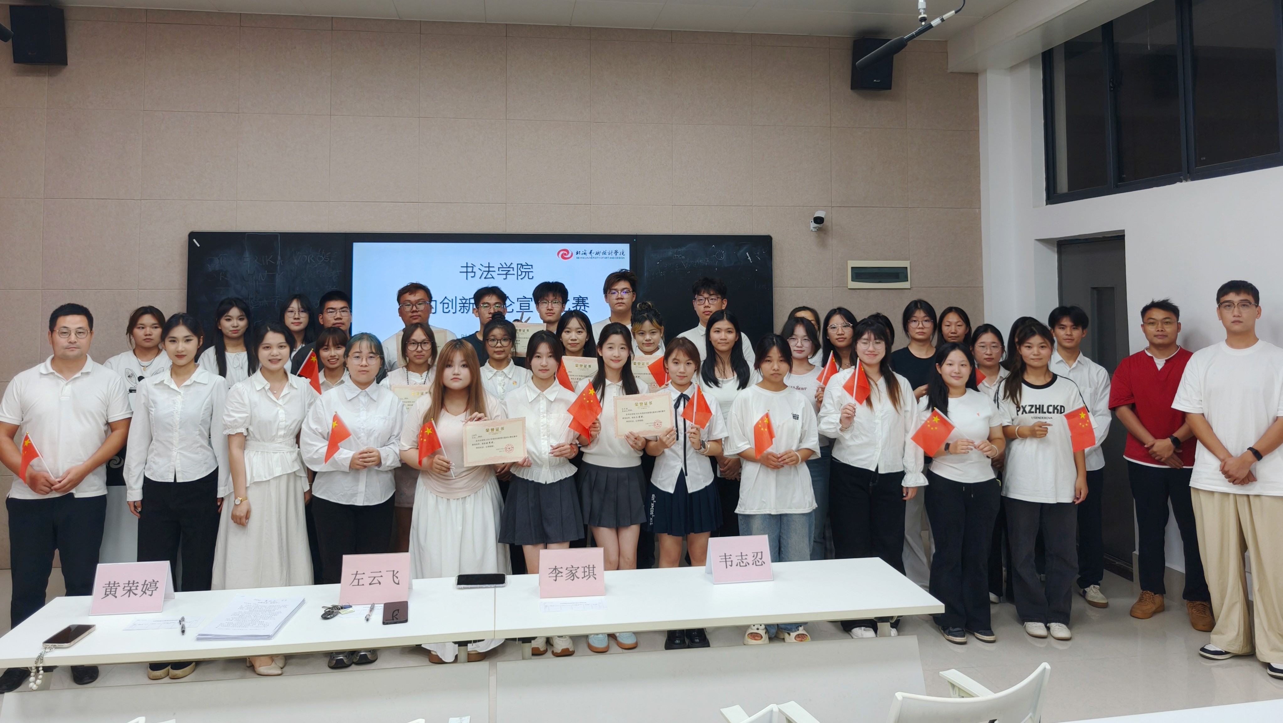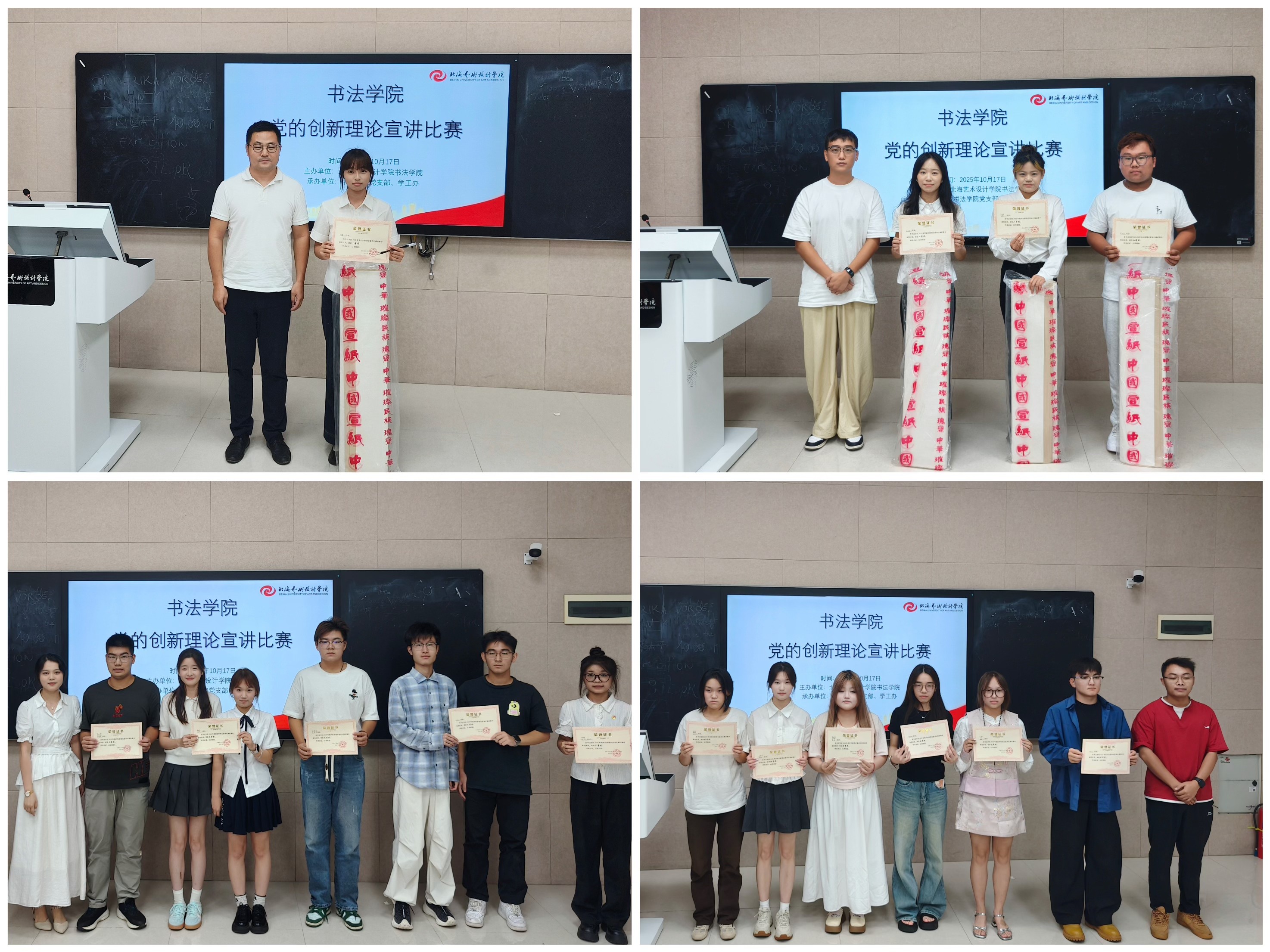 为扎实做好宣讲工作,持续推动党的创新理论入脑入心,10月17日,书法学院在西校区图书馆智慧教室506开展党的创新理论宣讲比赛。学院党支部副书记左云飞、副院长李家琪、韦志忍、黄荣婷出席活动并担任评委。