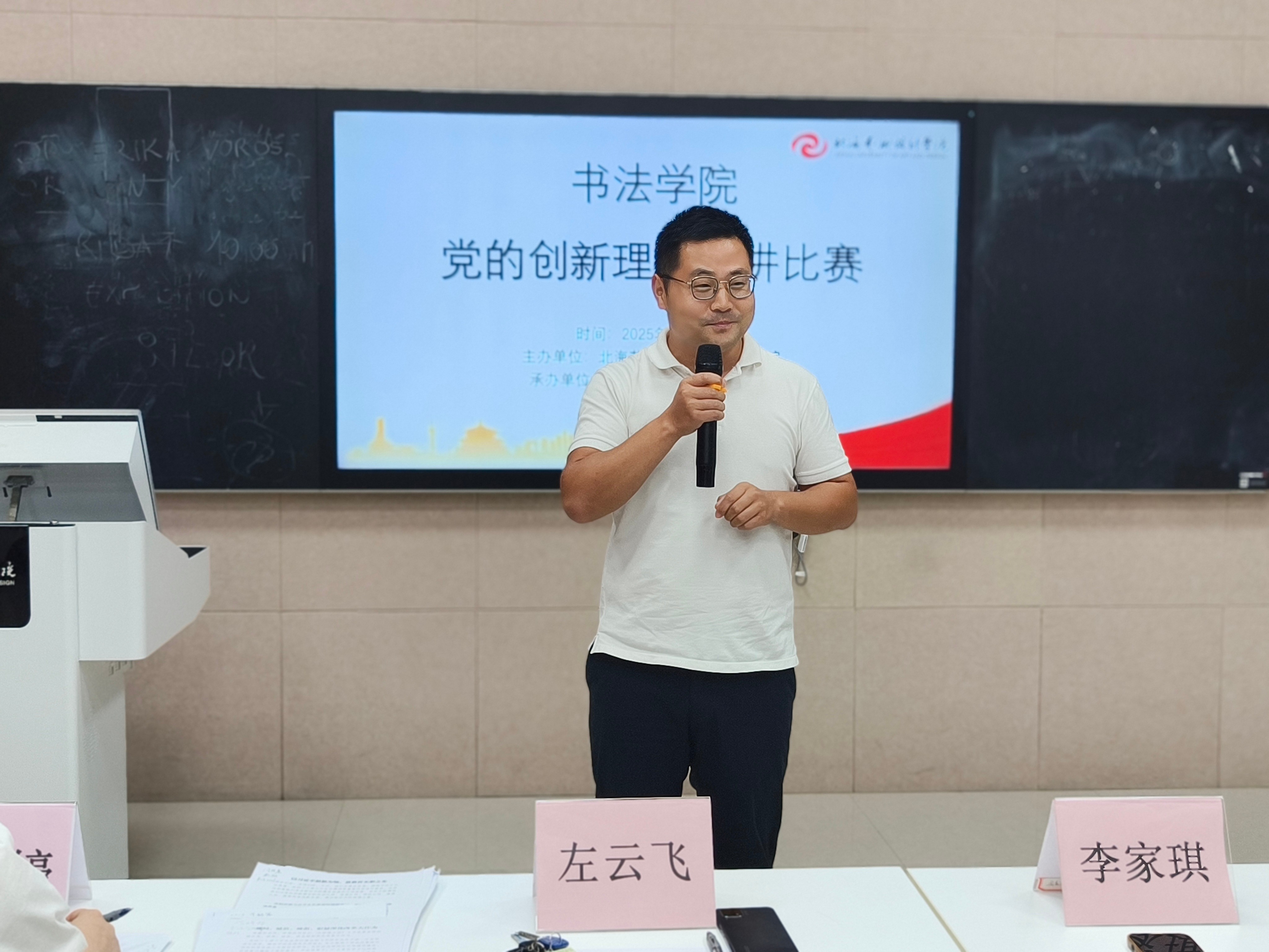 活动伊始,李家琪副院长为比赛致辞。他强调,书法学院学子既要练就“提笔能写”的专业本领,也要夯实信仰坚定的思想根基,提升“开口会讲”的宣讲水平,实现书法艺术与理论宣讲的有机结合,让党的创新理论在笔墨交融中焕发活力,展现新时代青年的信仰与担当。