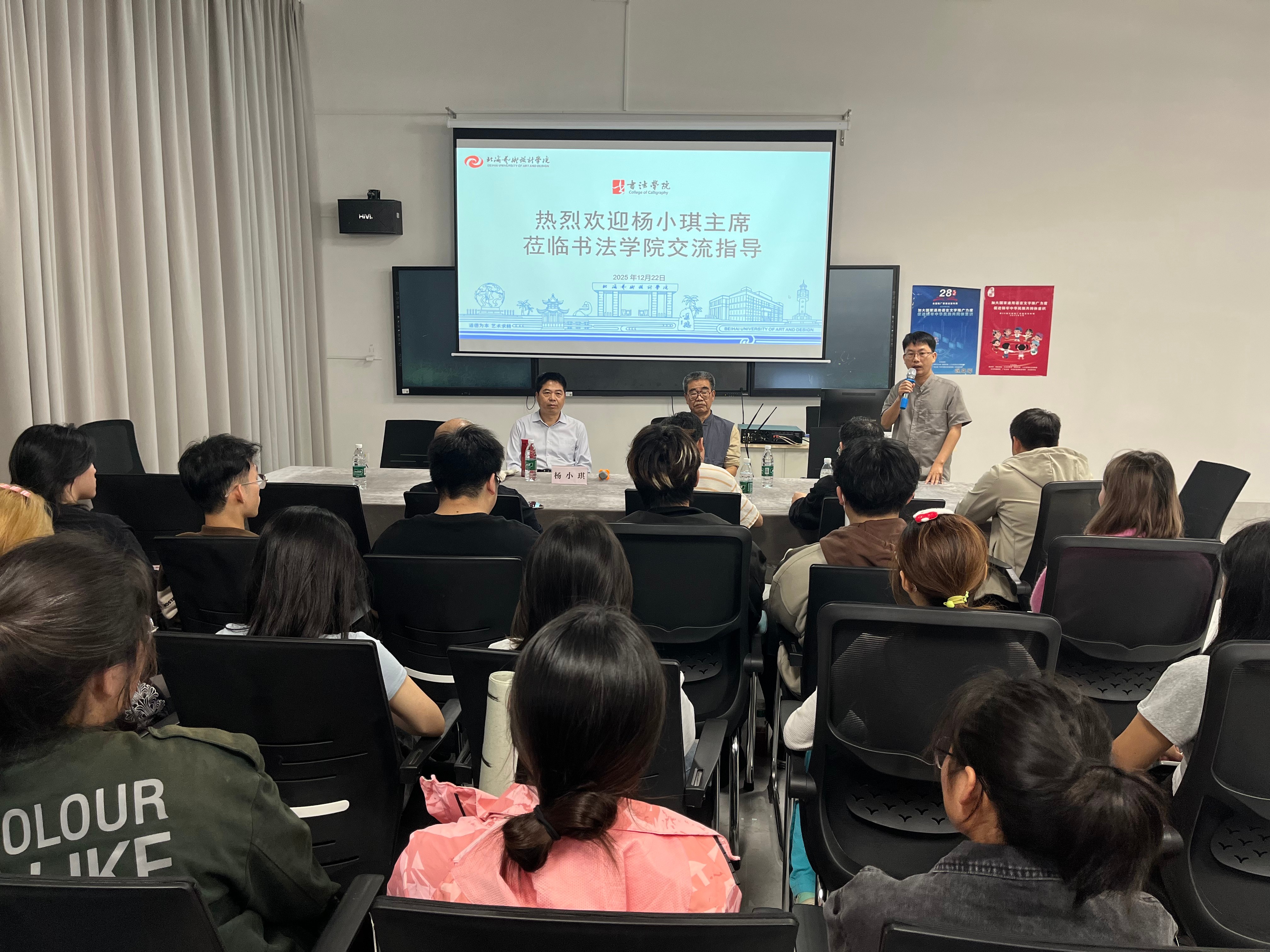 2025年12月22日下午,书法学院在艺德楼507书法学教研室举办艺术座谈会暨交流笔会。此次活动由书法学院常务副院长苏乃从主持,特别邀请中国书法家协会会员、国家二级美术师、陕西省书法家协会副主席、山西书学院院长杨小琪为主讲嘉宾。西安市书法家协会第五届副主席、西安美术学院客座教授李和生及书法学院师生代表共同参与。