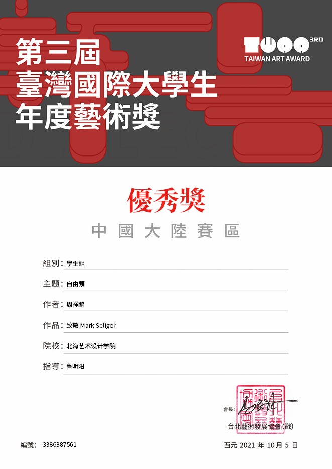 摄影系2019级学生周祥鹏的作品《致敬哈尔斯曼》在由台北艺术发展协会主办的第三届台湾国际大学生年度艺术奖大陆赛区荣获铜奖(指导教师:鲁明阳)、作品《致敬Mark Seliger》学生组荣获优秀奖(指导教师:鲁明阳)。此赛事由台北市教育局发起主办,联合台北艺术发展协会承办。