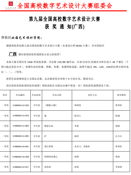 美术学院摄影系与绘画系学生荣获第九届全国高校数字艺术设计大赛(未来设计师NCDA大赛)全国总决赛二等奖1个,三等奖1个。华南赛区一等奖7个,二等奖4个,三等奖6个。除学生组外,林昌华老师《理想生活之梦里、梦外》作品荣获华南赛区教师组二等奖,唐海副教授《丫人甲的MIUI生活》作品荣获华南赛区教师组三等奖。唐海荣获《优秀组织教师》、《优秀指导教师》称号,李炫勋、郭刚、鲁明阳、孔令石、陈越荣获《优秀指导教师》称号,我校荣获广西赛区《优秀组织奖》。