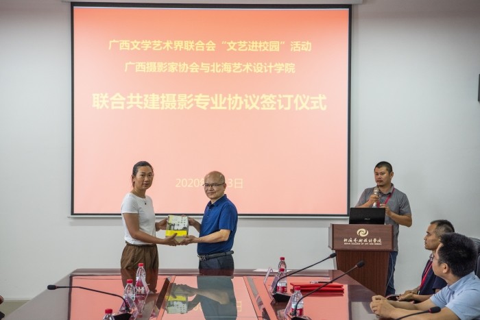 7月3日下午,广西文学艺术界联合会到我校开展“文艺进校园”活动,广西摄影家协会与我校签署了联合共建摄影专业协议,签约仪式在西校区图书馆五楼会议室举行。莅临本次活动的嘉宾有广西摄影家协会主席、秘书长施兴良,广西摄影家协会副主席邓超斌、蓝建强,广西摄影家协会理事、北海市摄影家协会主席谭瑞军,广西君人庆科技有限公司总经理、广西摄影家协会会员覃媚。我校党委书记李高南、副校长胡胜以及美术学院领导出席了本次签约仪式,并与来访嘉宾开展深入、富有成效的合作交流。