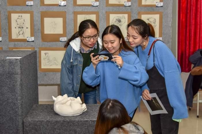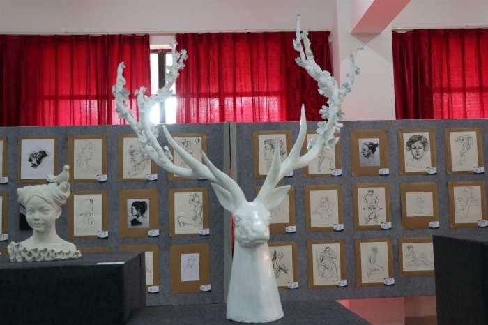 此次展览有老师和学生作品,其中作品除了有雕塑作品 还有一些绘画作品。进入展厅老师和学生的作品令我们惊叹, 在场的师生无不细细品酌每件作品的精妙之处,给我们带来 了一场视觉艺术上的饕餮盛宴。