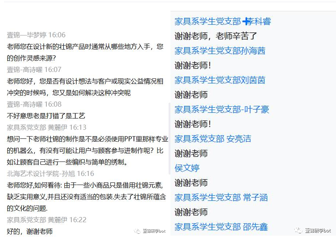 8月11日,美术学院雕塑专业与北京林业大学艺术设计学院本科第二学生党支部、材料学院家具学生党支部开展联建活动。活动由锦元和设计工作室创始人、壮锦文创设计师、工艺品设计师李岢老师作为主讲,展开题为《壮锦现代化传承和再设计》的讲座,本次活动以腾讯会议为平台,由桂林市非物质文化遗产保护和传承中心支持举办。