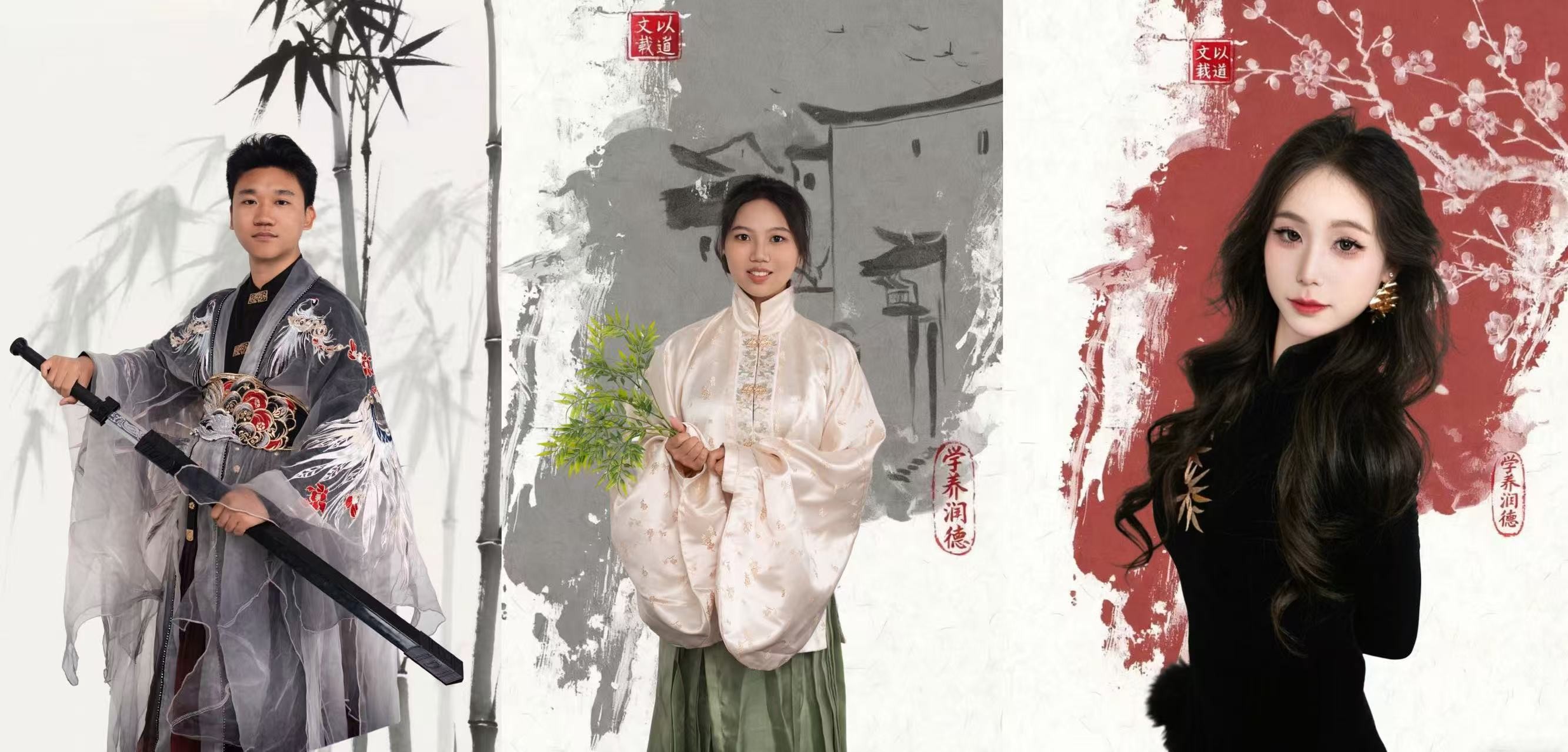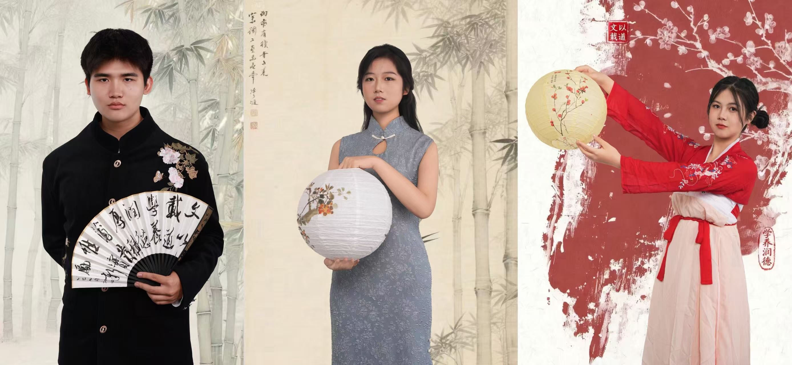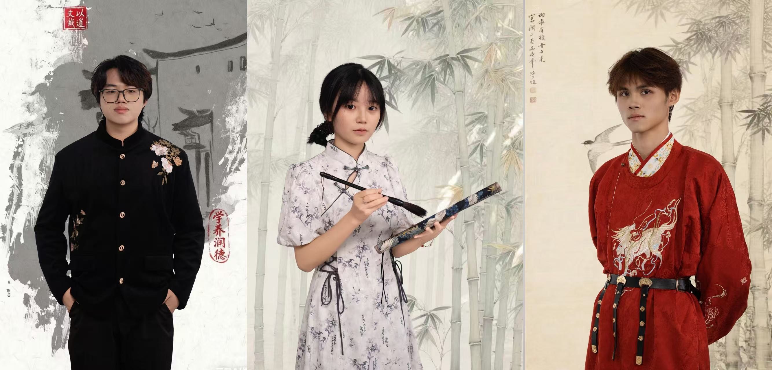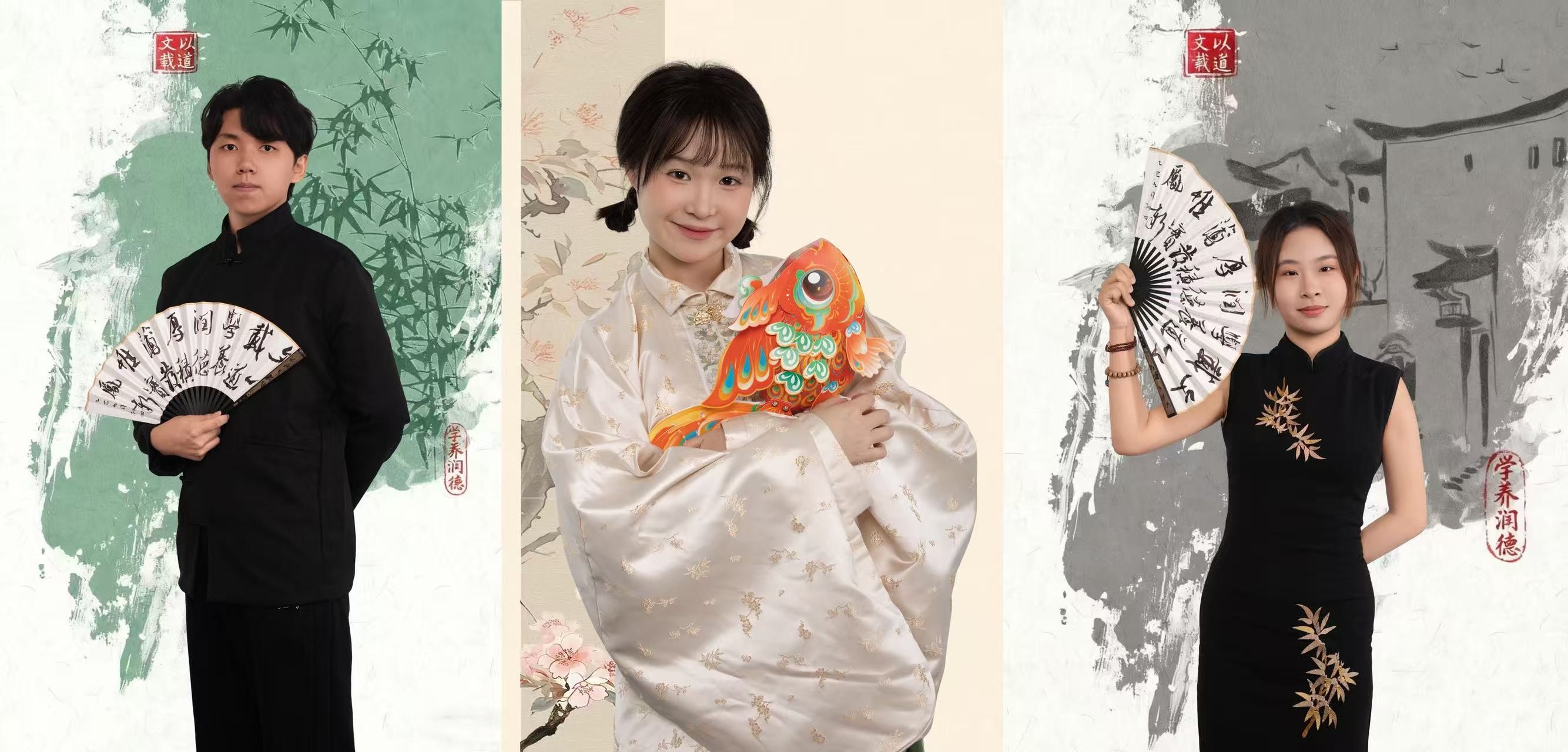 本次宣传照拍摄以中式美学为核心视觉导向,现场布置与服饰搭配深度融入传统元素。镜头前,学生干部们身着整洁古典服饰,或手持毛笔、典籍展现文院学子的书卷气,或并肩而立传递团队协作的凝聚力,或面带微笑彰显青年学子的朝气,每一个姿态都精心打磨,每一张面孔都洋溢着对学生工作的热忱精准营造出“书卷气”与“古典韵”交融的文化氛围。