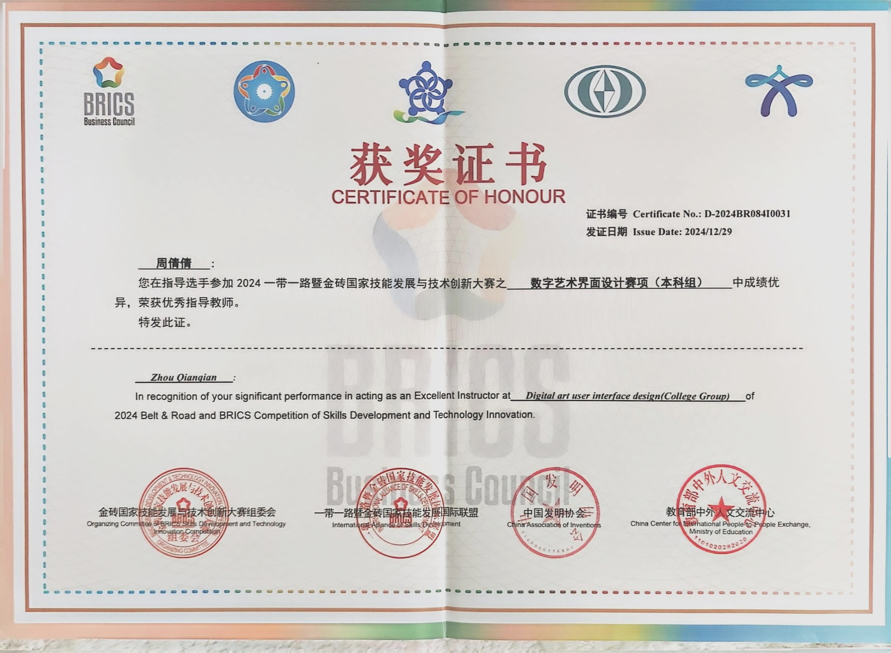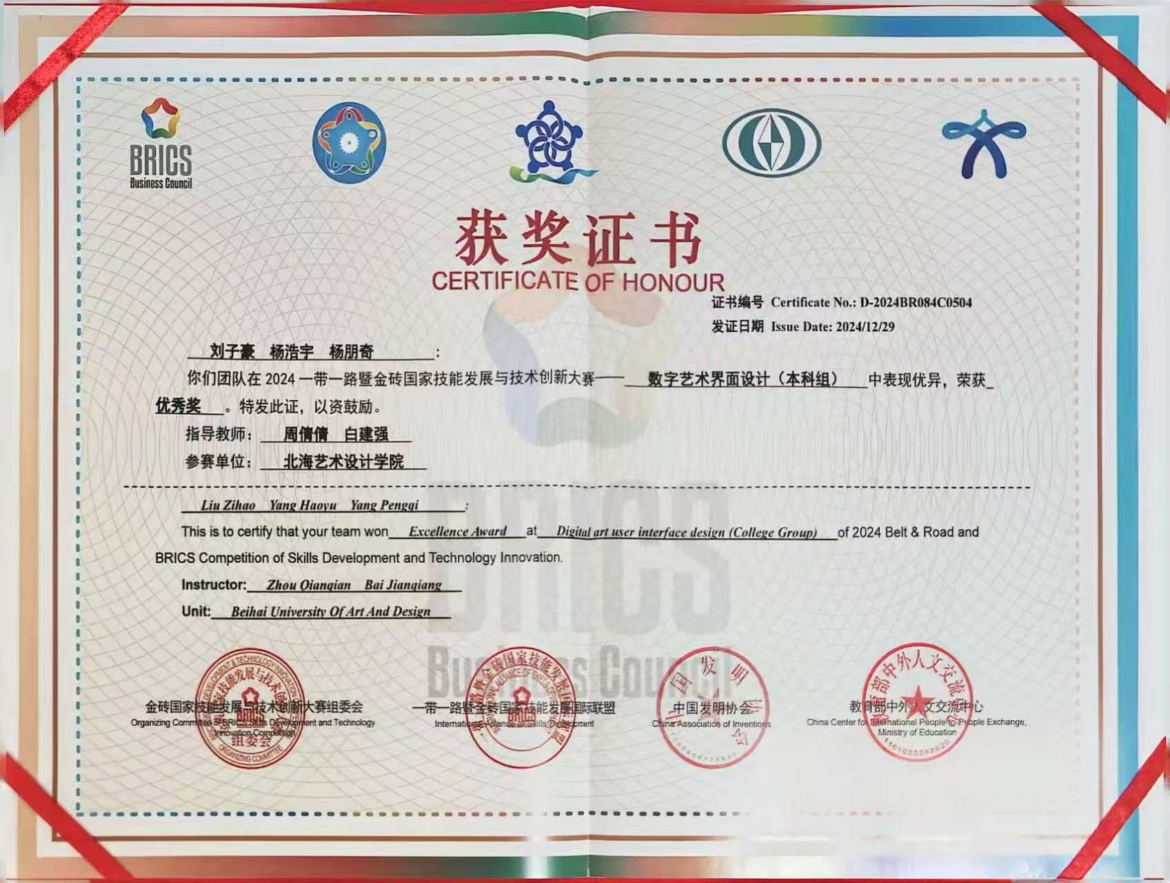 一带一路暨金砖国家技能发展与技术创新大赛是教育部官方认证的国家级A类学科竞赛本届赛事——数字艺术界面设计赛项旨在响应《国家“十四五”数字经济发展规划》及“一带一路”倡议,深化产教融合,推动人工智能与艺术设计的跨界创新吸引了全球200余所高校、超千名选手同台竞技,院师生凭借前沿技术应用与创新设计思维脱颖而出,荣获国家级二等奖1项,国家级优秀奖2项,大赛“优秀组织奖”1项,两名教师获“优秀指导教师”,彰显了学院在AI时代“数智化转型”的教学成效