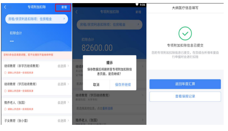 若您需要新增或修改专项附加扣除信息,可点击【新增】, 跳转至采集界面。采集完成后,可选择跳转回年度汇算继续 填报。
