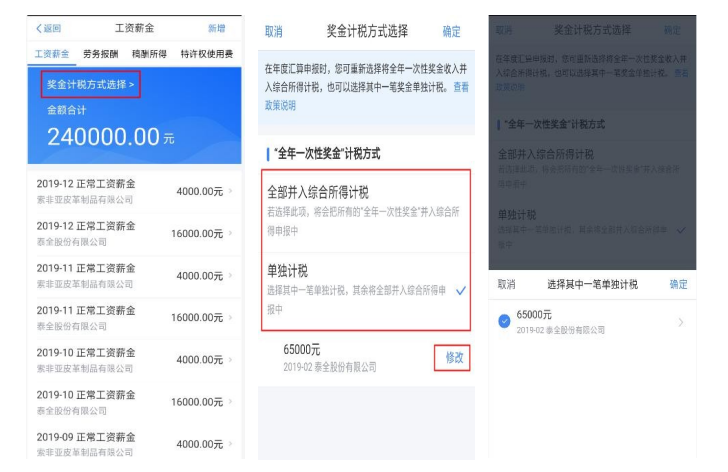 年度汇算时,如您选择将全年一次性奖金合并至综合所得计税的,或者有多笔全年一次性奖金的,可通过 【奖金计税方式选择】进行设置。