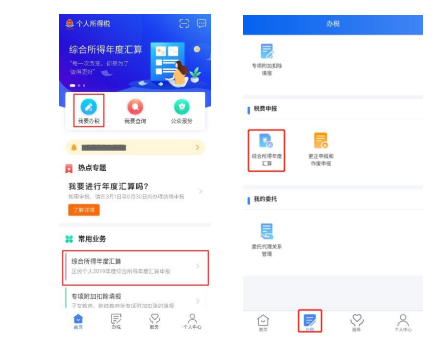 使用手机APP 端申报,您可以从以下入口进入年度汇算: 一是从首页的【常用业务】区块的【综合所得年度汇算】进入;二是从【快捷入口】-【我要办税】下或底部【办税】菜单进入后,点击在【税费申报】下的【综合所得年度汇算】。