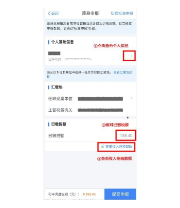 (一)核对个人基础信息、汇缴地、查看收入明细数据, 确认已缴税额。