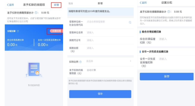 您可在税款计算界面,点击【全年一次性奖金应纳税额】, 进入详情填写相应收入。若您有公益性捐赠支出,您可点击【准予扣除的捐赠额】(或在收入和税前扣除信息界面的【准 予扣除的捐赠额】)进入捐赠详情界面进行【新增】和【设 置扣除】。